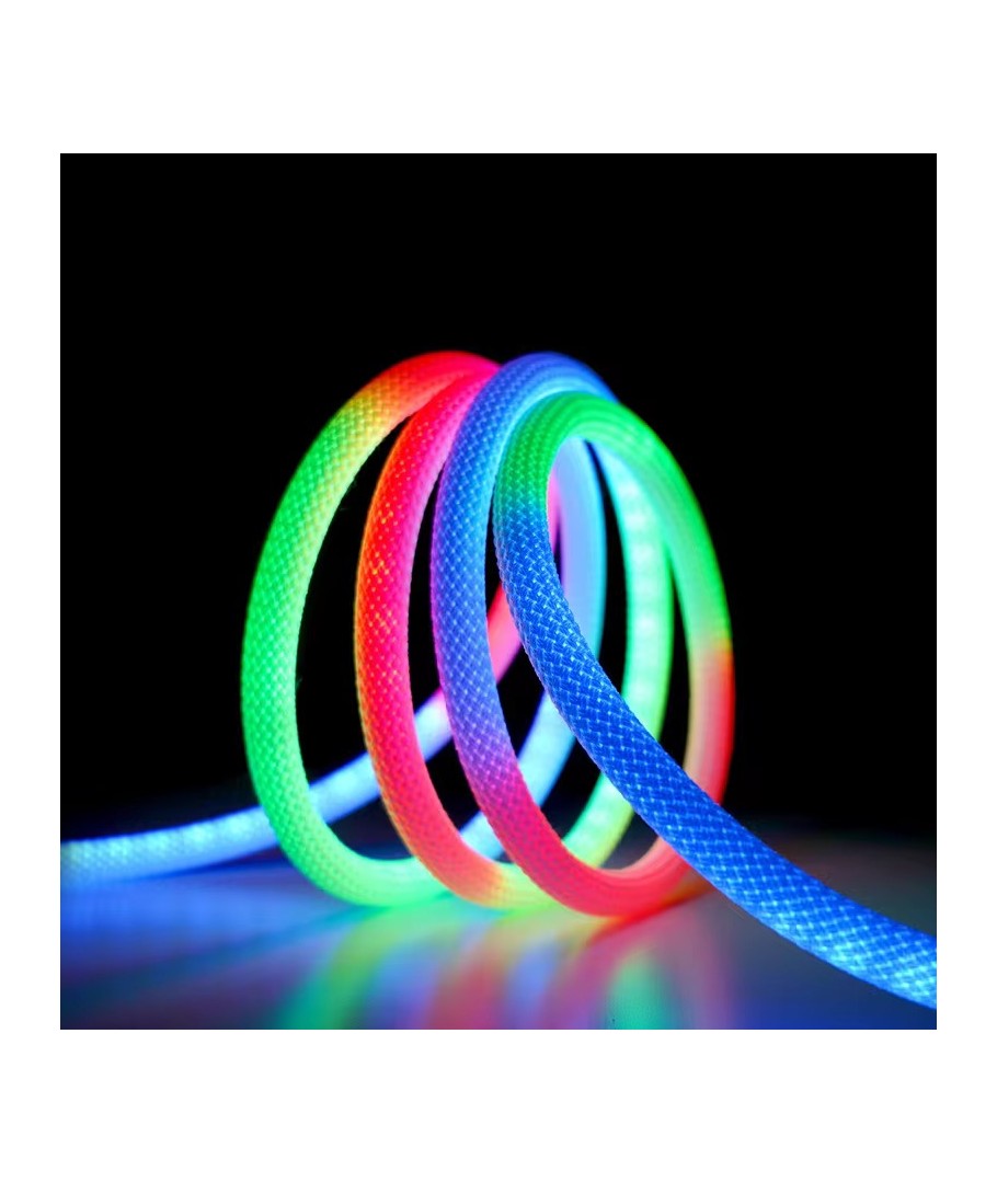 Oplev en verden af farver med vores 3W/m RGBIC Neon Flex strip med vævet reb - en 3 meter RGBIC neon flex, der bringer lys og liv til ethvert rum med sin dynamiske farvespil og fleksible design.