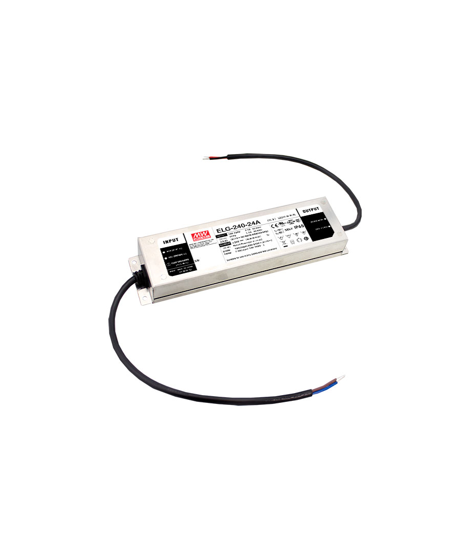 Dæmpbar kvalitets LED strømforsyning fra Mean Well til 230VAC. Mixed Mode udgang (spændingsstabiliseret til maksimalstrøm med efterfølgende strømstabilisering C.V. +C.C.), LED driveren er IP67 godkendt til inde og udendørs.