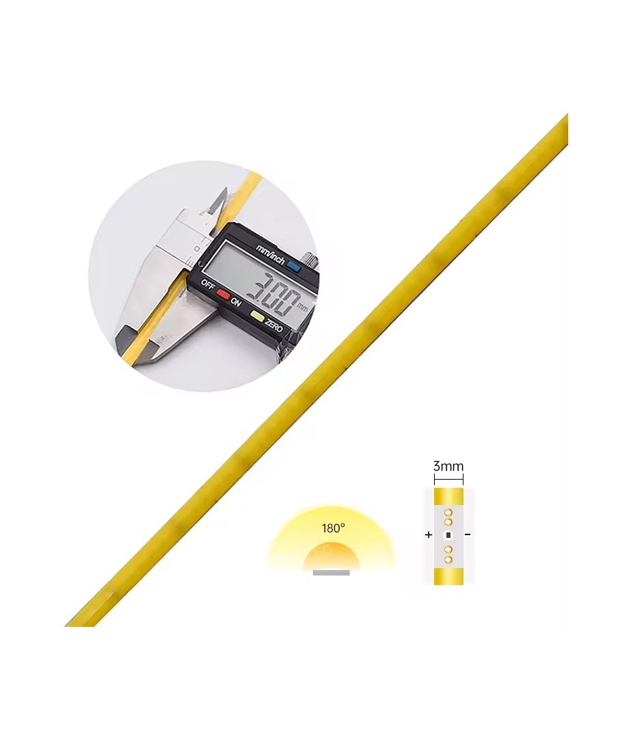Ekstra tynd COB strip på kun 3mm bredde der kombinerer høj ydeevne med en kompakt bredde, perfekt til kreative og diskrete belysningsløsninger.