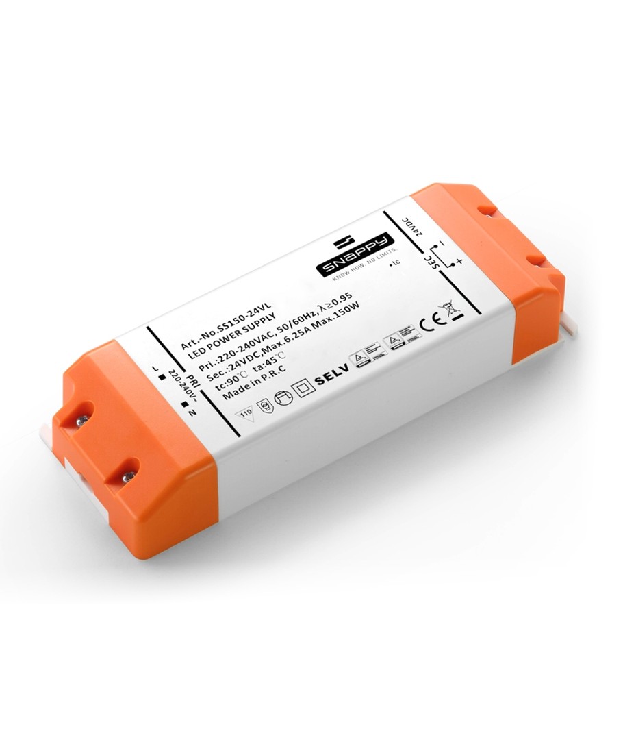 Kvalitets LED driver fra Snappy på 1-150W som leverer en konstant spænding på 24V DC. Kan ikke anbefales til LED pærer.