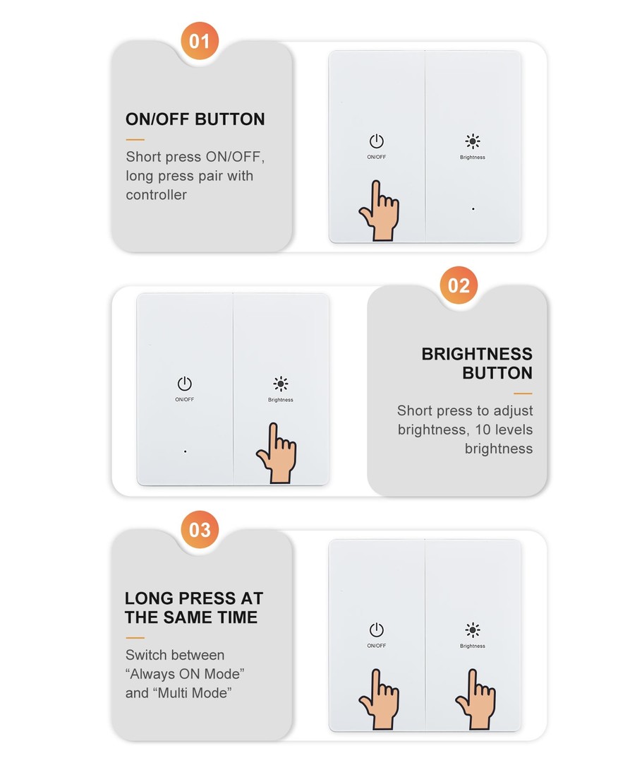 Via de medfølgende vægkontakter kan lysstyrken indstilles, samt der kan skiftes mellem at sensoren er aktiv eller lyset tændes/slukkes på kontakten.