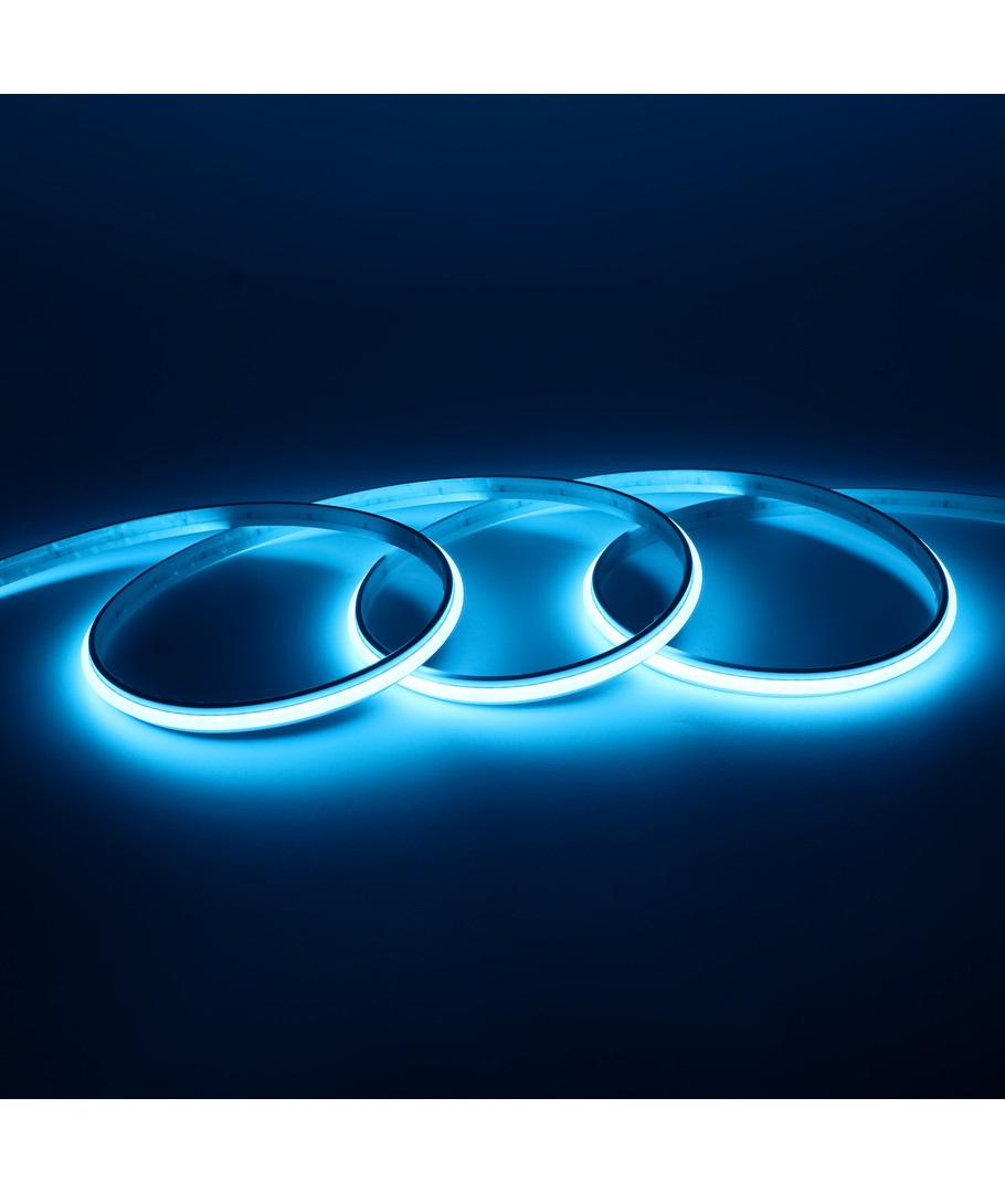 Med denne lyseblå COB-LED strip bringer du en moderne og elegant belysning til dit hjem eller kontor. Den er hævet i kvalitet med 240 LED pr. meter, hvilket giver en dot-free lyskilde, der sikrer et kontinuerligt og behageligt lys.