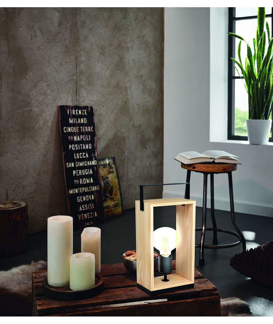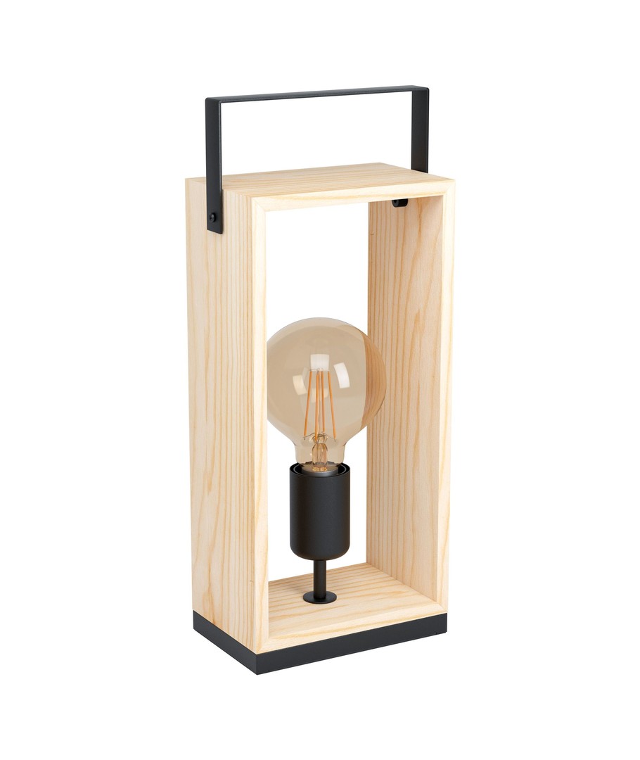 En rustik, kunstnerisk bordlampe af træ og stål i firkantet form.