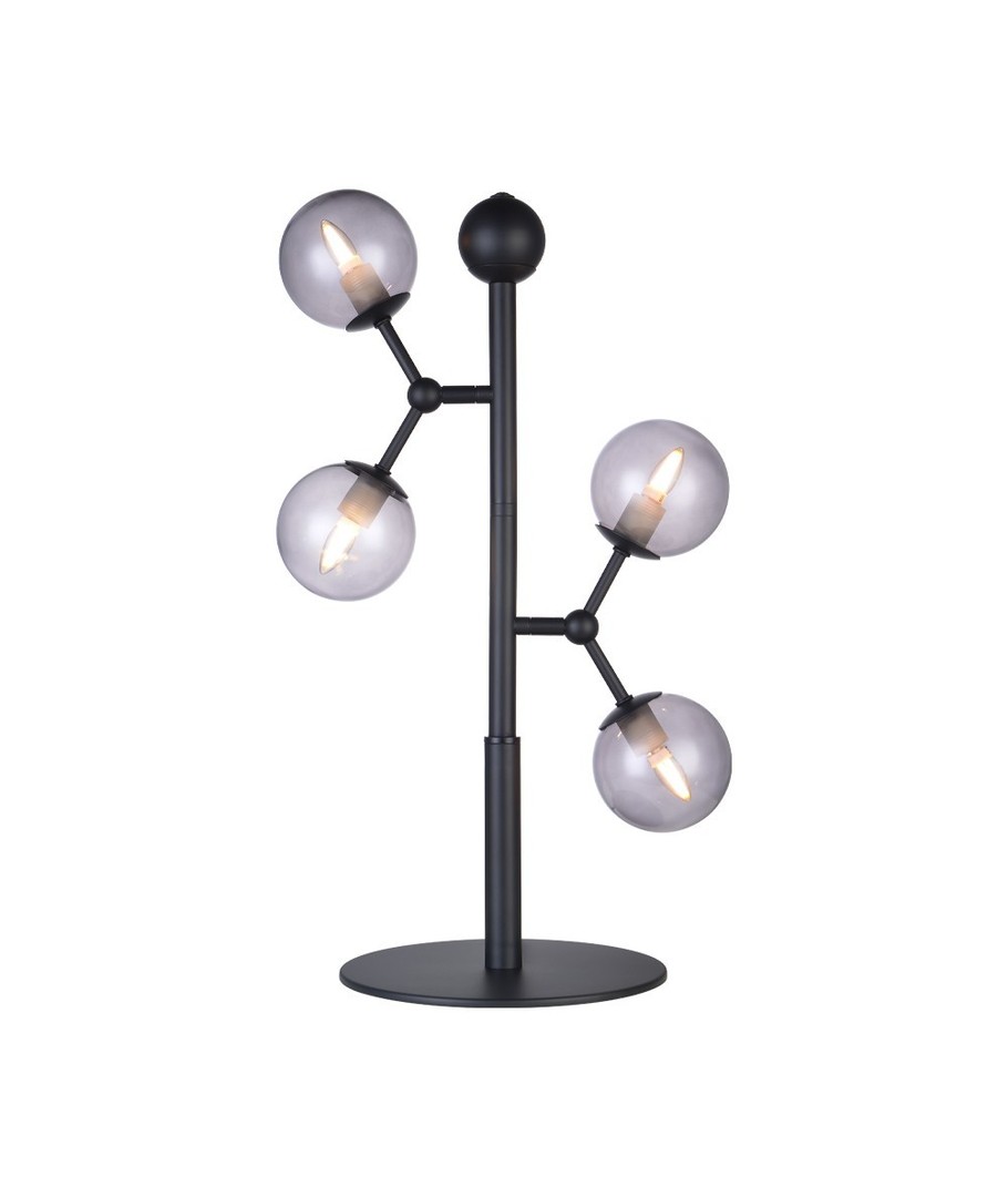 Bordlampen har en sort base og en smoke glas skærm, som sammen skaber en unik visuel kontrast. Lampekroppen fremstår moderne og stilfuld, hvilket gør den til en ideel tilføjelse til både klassiske og moderne indretninger.