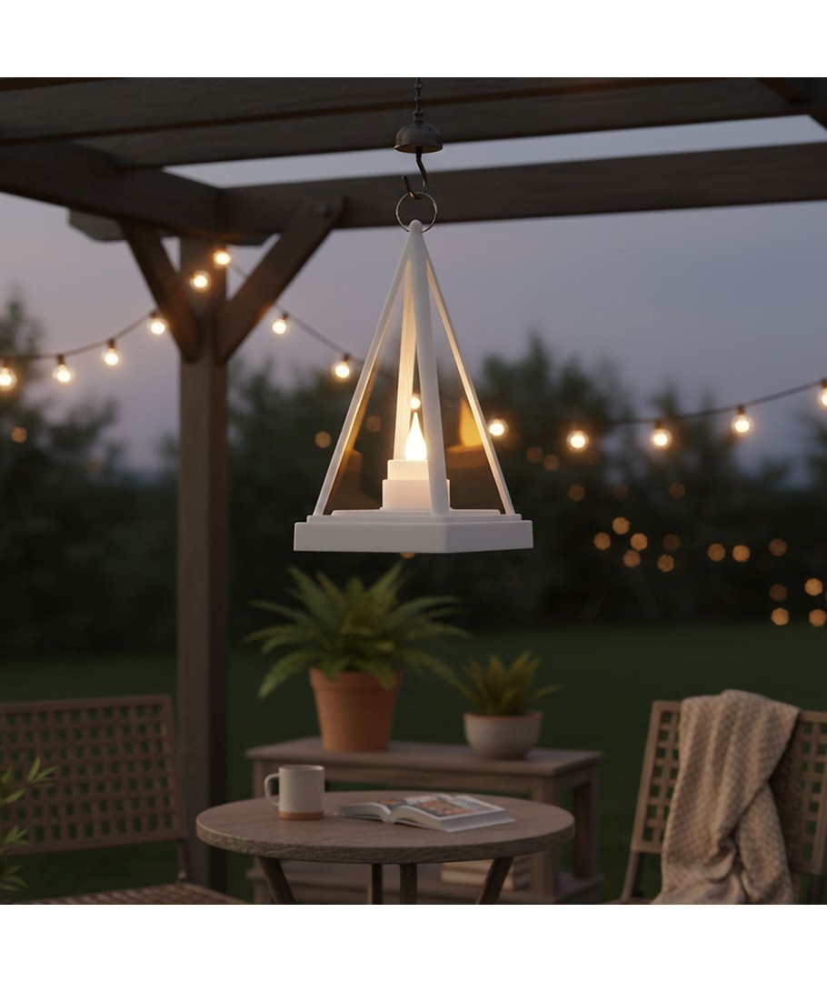 Den trekantede LED lanterne i hvid er et alsidigt og stilfuldt lysvalg til både indendørs og udendørs brug, der sikrer en hyggelig stemning.