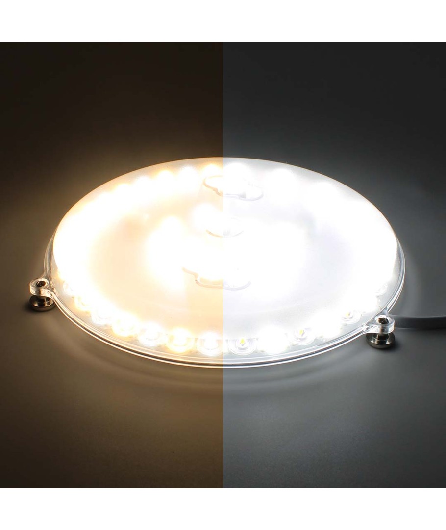 LED indsatsen tilsluttes nemt til en 230V forsyning, og dens kompakte dimensioner på 25 x Ø230 mm gør det enkelt at installere den i eksisterende armaturer. Den passer perfekt i rum, hvor pladsbesparelse og effektiv belysning er en prioritet.