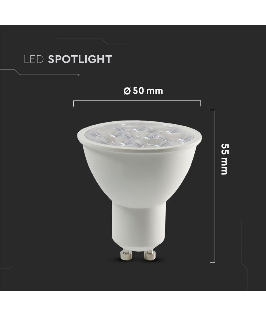 Med en kompakt størrelse på 55 x Ø50 mm, passer denne LED spot nemt ind i standard GU10 armaturer og sikrer en problemfri installation.