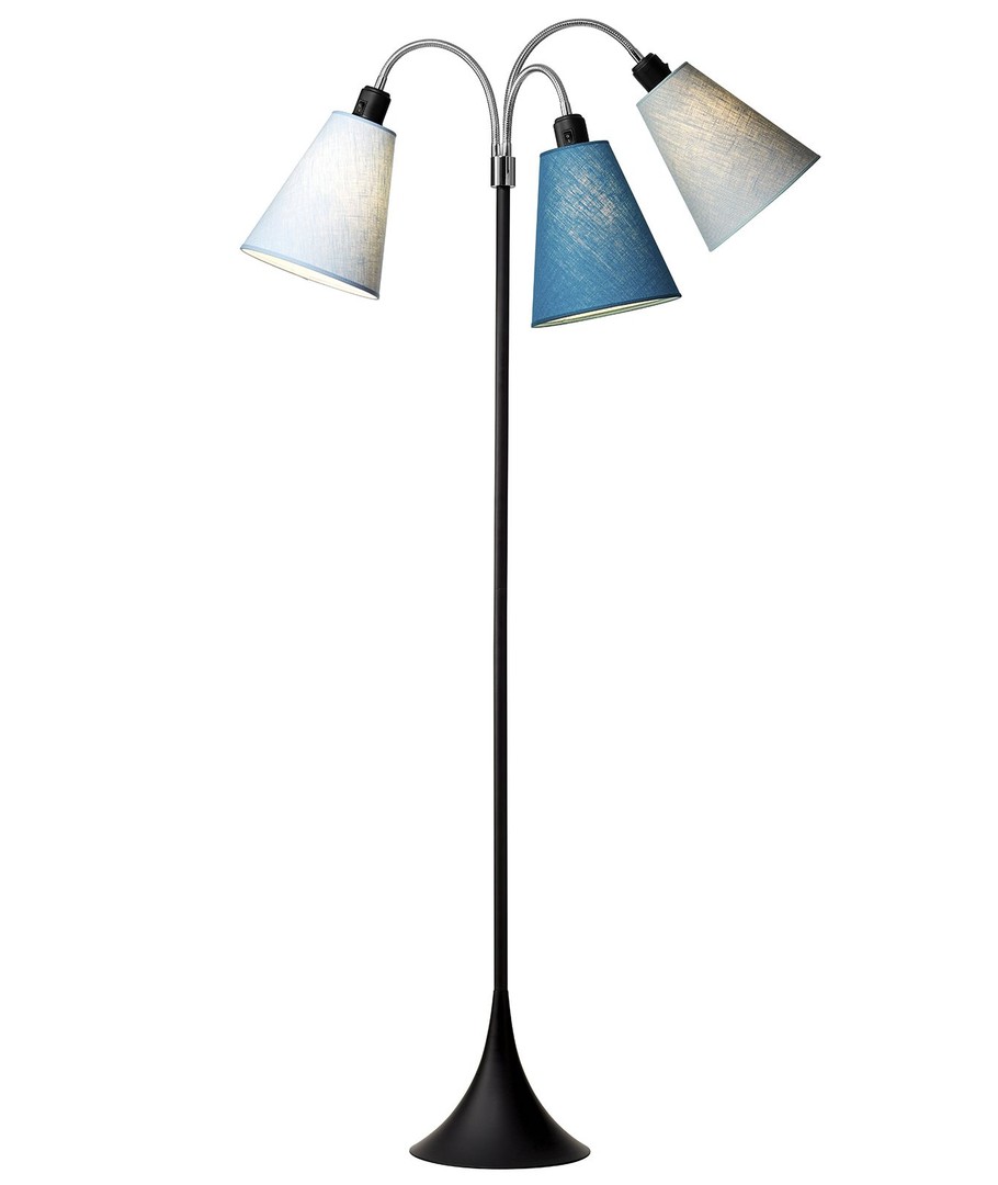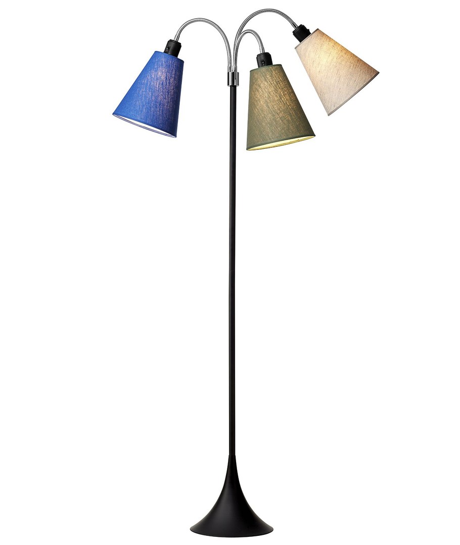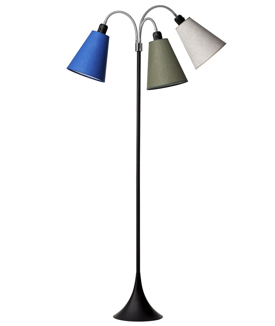 En høj-funktionel gulvlampe med et helt særligt "glat" design, samt 3 skærme i forskellige farver.