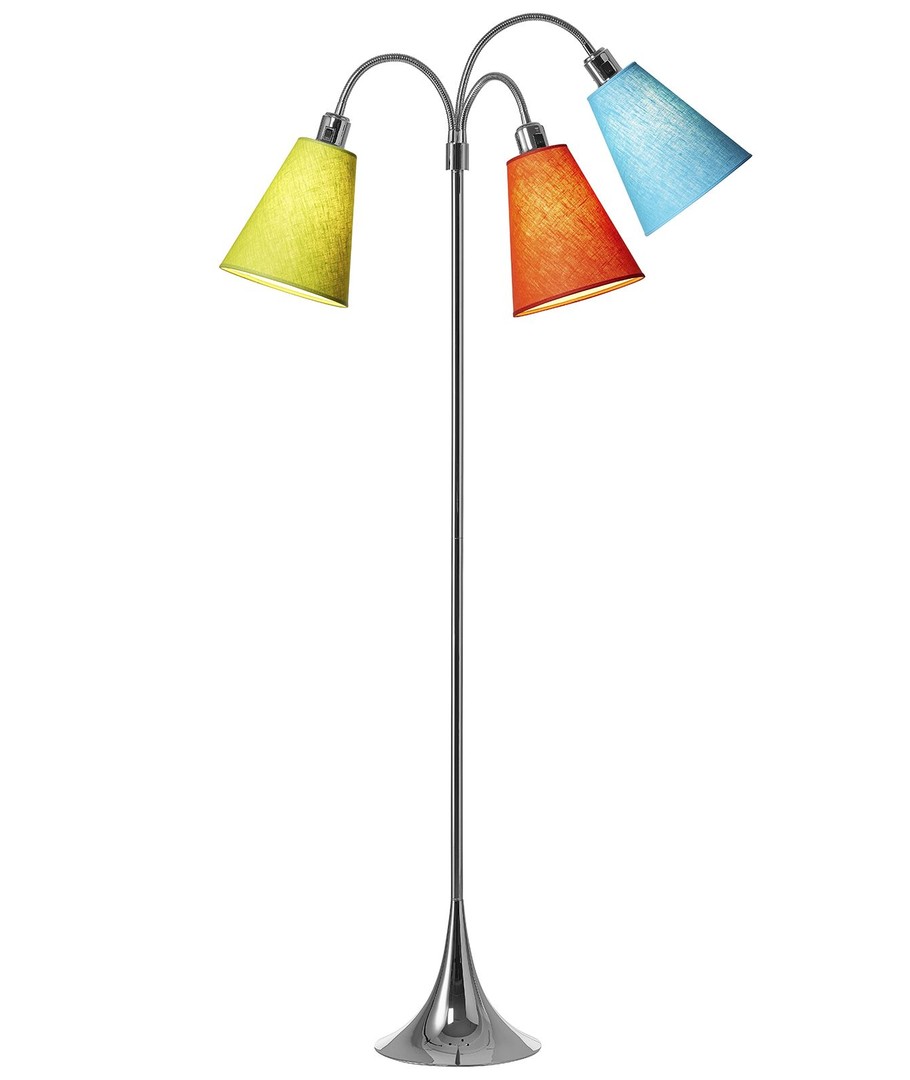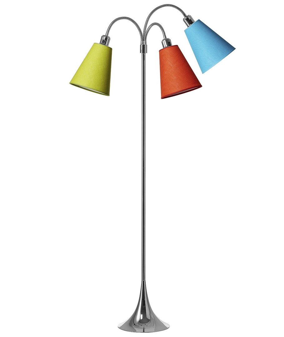 En festlig gulvlampe i elegant design, med 3 skærme i forskellige, spraglede farver.