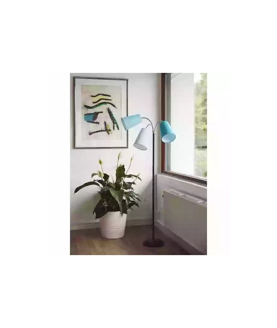 Salsa Gulvlampe fra danske Nielsen Light er en super trendy lampe med 3 fleksible kromarme. Foden er sort, og de tre stofskærme er i farverne lyseblå, petroleum og aqua.