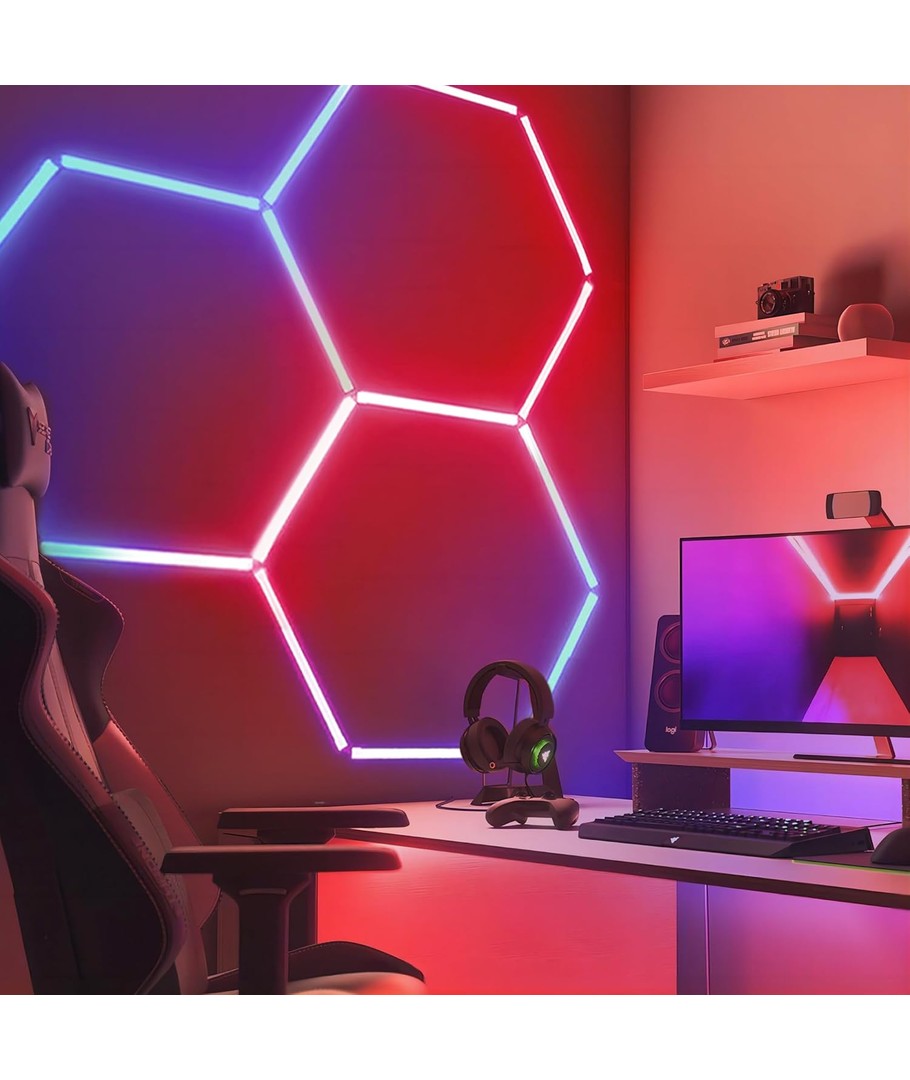 Med Hexagon RGBIC 3 felt komplet sæt får du en alt-i-en belysningsløsning, der kombinerer teknologi og design for at skabe den perfekte atmosfære i ethvert rum.