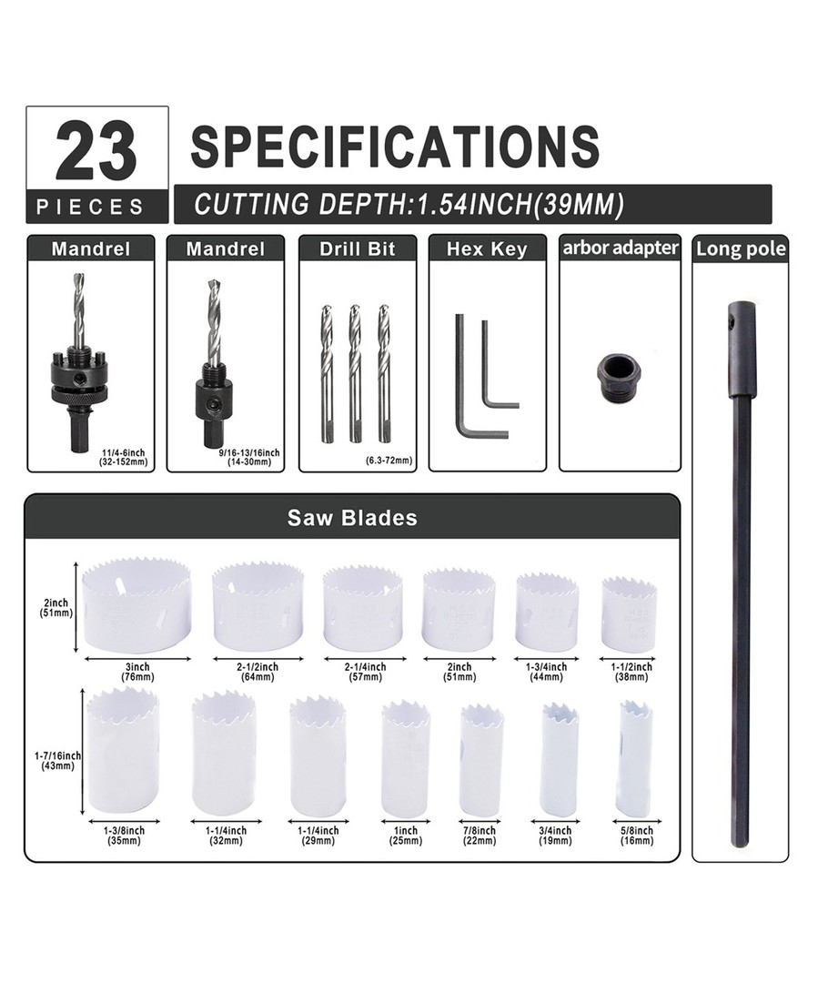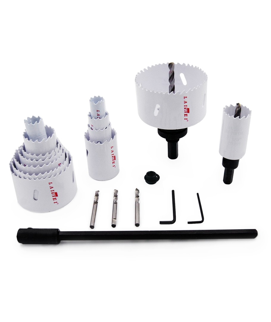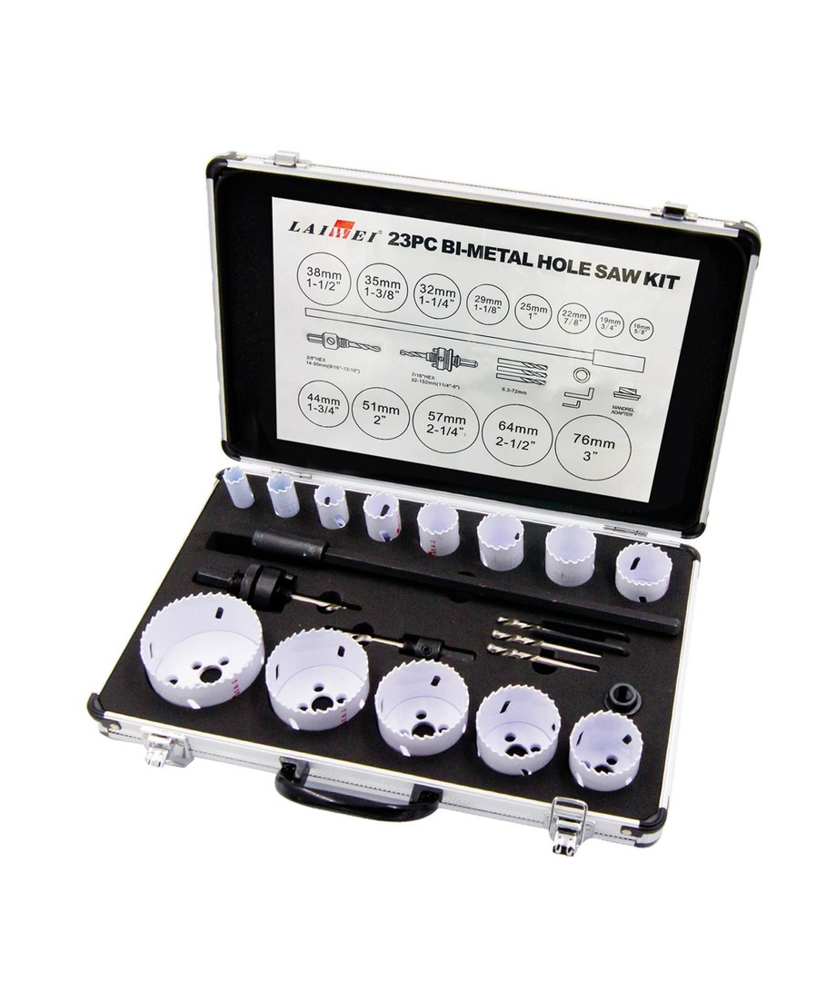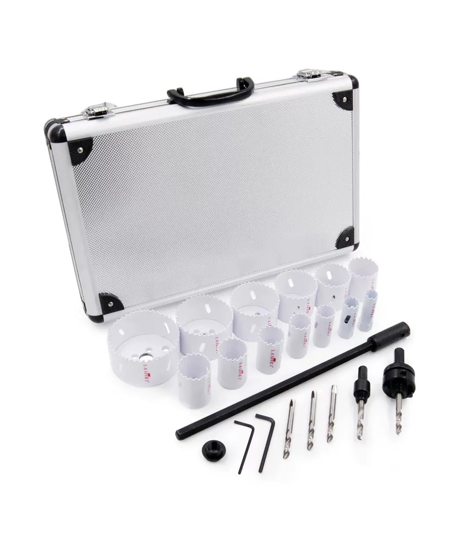 Komplet sæt med alt hvad du skal bruge for at bore huller i diverse træ- og loftsplader til montering af spots, ledninger mm. Leveres komplet i lækker aluminium kuffert.