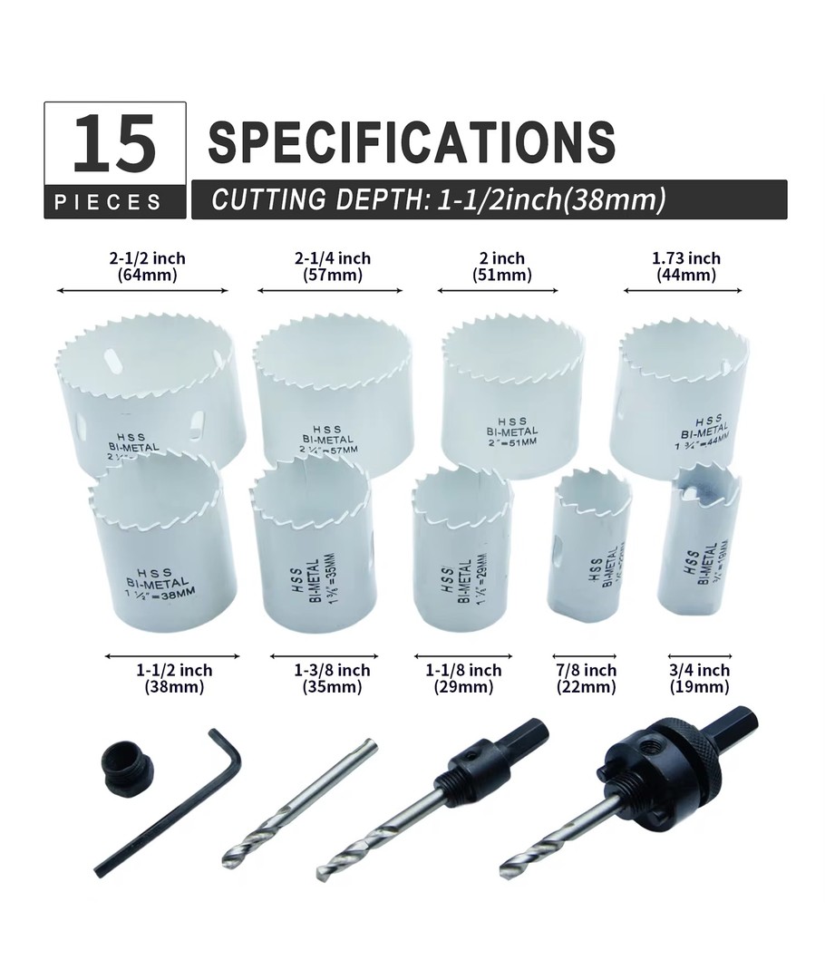 Komplet sæt med alt hvad du skal bruge for at bore huller i diverse træ- og loftsplader til montering af spots, ledninger mm.