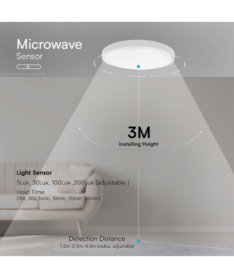 Sensorens rækkevidde er justerbar, vælg mellem 1-2m, 2-3m eller 4-5m radius ud fra en monteringshøjde på 3m.