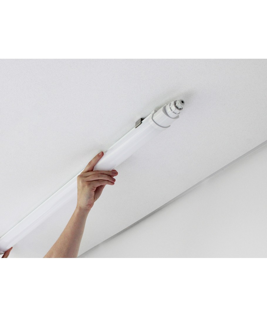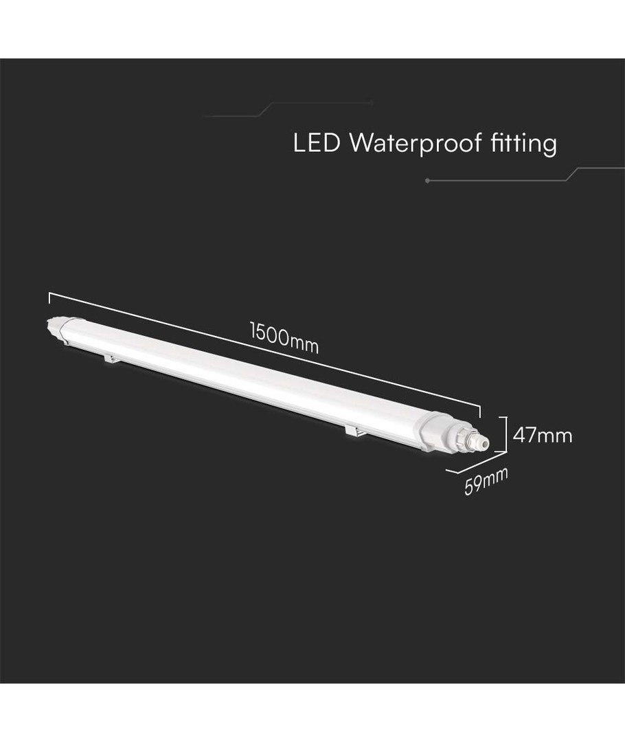 Armaturets mål er 59 x 1500 x 47 mm, hvilket gør det velegnet til en lang række installationer. Med en IP65-klassificering er produktet designet til at modstå vandstænk og regn, hvilket gør det ideelt til både indendørs og udendørs anvendelse. Den integrerede lyskilde sikrer lang levetid og lav vedligeholdelse, hvilket gør det til en økonomisk attraktiv løsning.