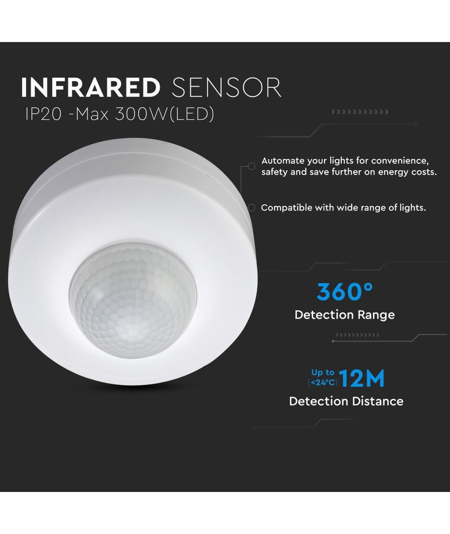 Opdag en effektiv løsning til intelligent lysstyring med vores Loftsensor med manuel overstyring, designet til indendørs brug med en maksimal belastning på 300W.