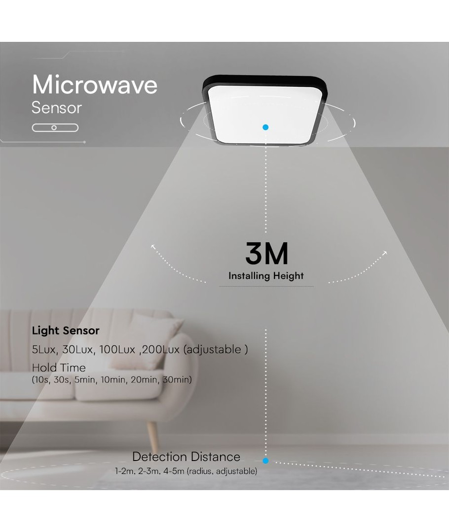 Designet med sort kant og inkluderende fjernbetjening gør det nemt at styre lyset baseret på dine præferencer. Den indbyggede sensor tilføjer et ekstra lag af innovation ved automatisk at tilpasse lyset efter tilstedeværelse.