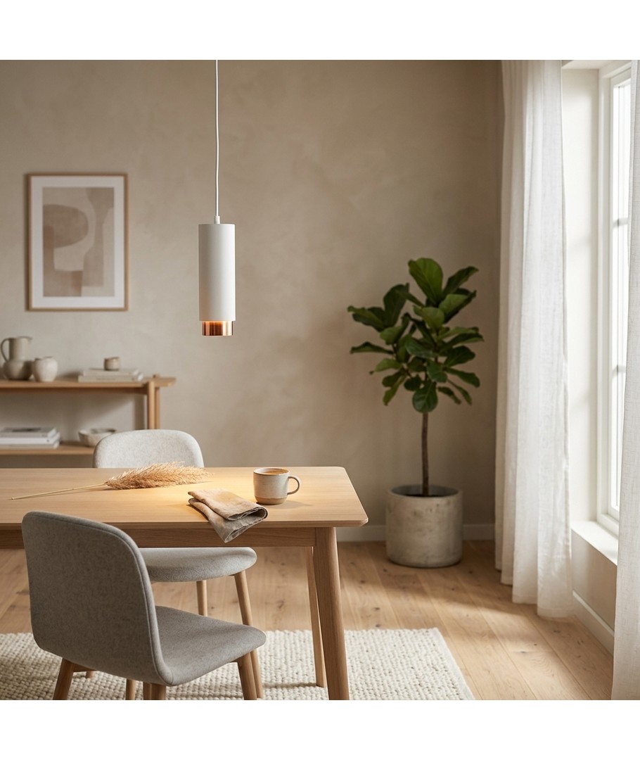 Flot og enkel pendellampe i farven hvid med mat rose guld i bunden.