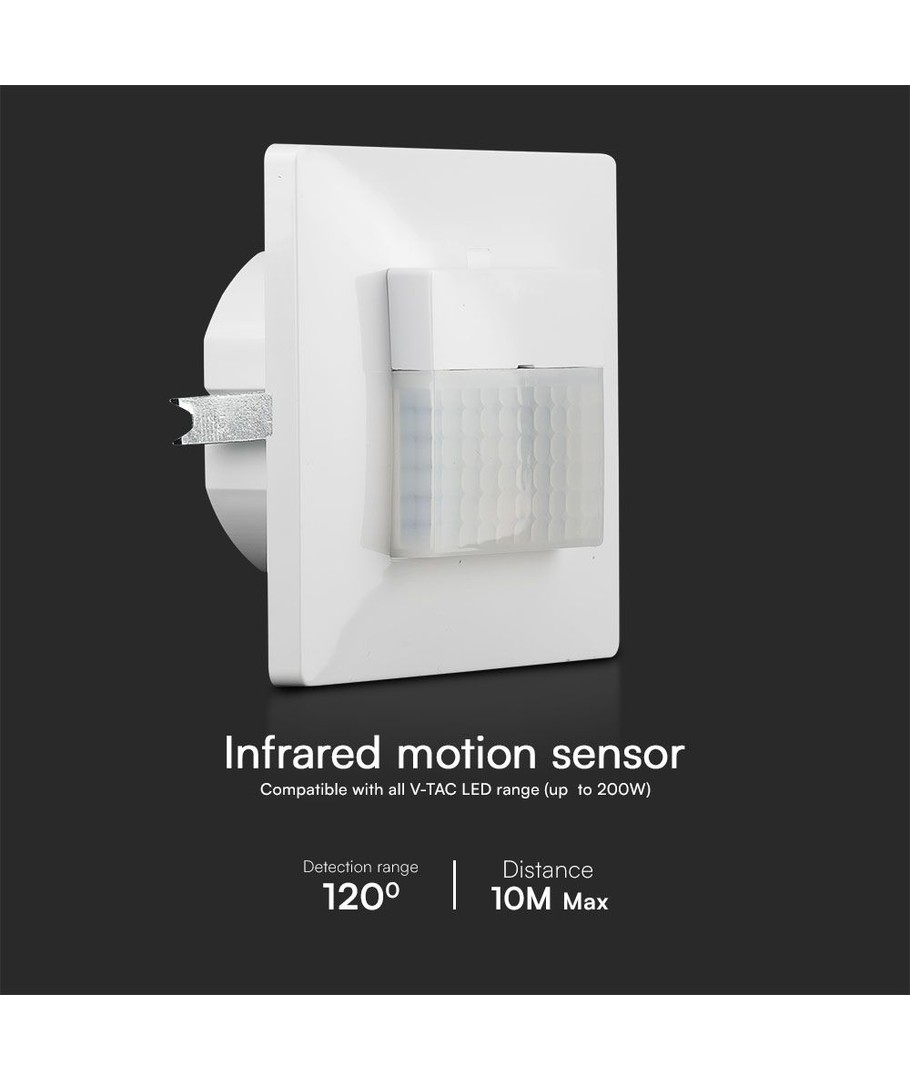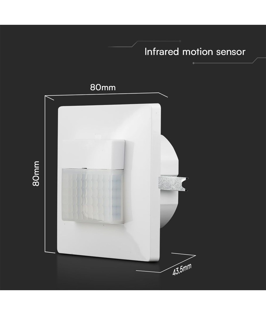 Den vægmonterede bevægelsessensor i hvid er designet til indbygning og tilbyder præcis bevægelsesregistrering med infrarød PIR-teknologi, hvilket gør den ideel til automatisering i hjemmet eller erhvervslokaler.