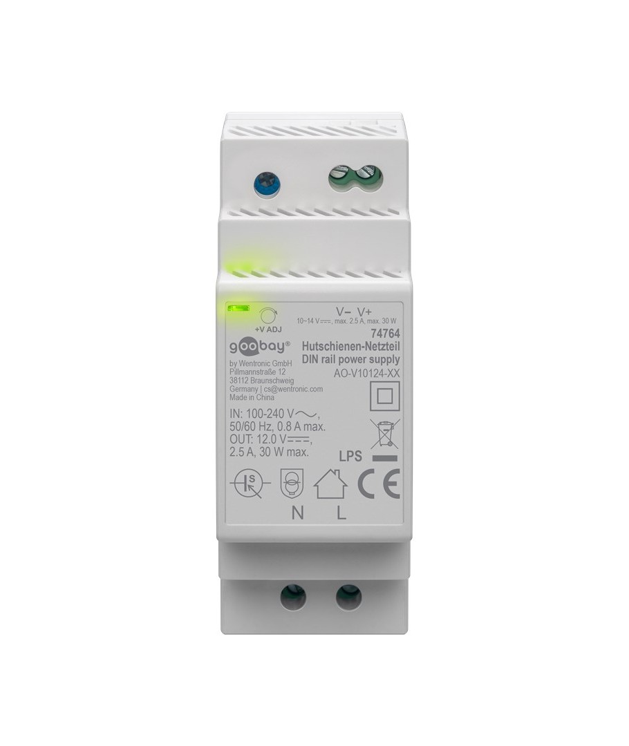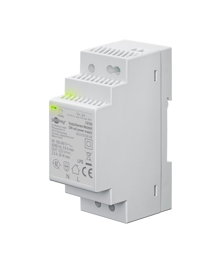 12V DC 2,5A strømforsyning til DIN skinne montering.