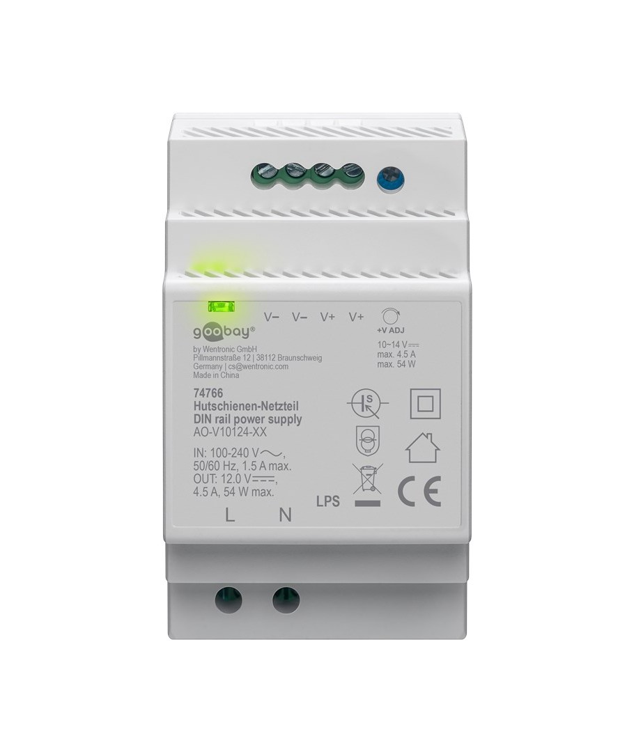 12V DC 4,5A strømforsyning til DIN skinne montering.