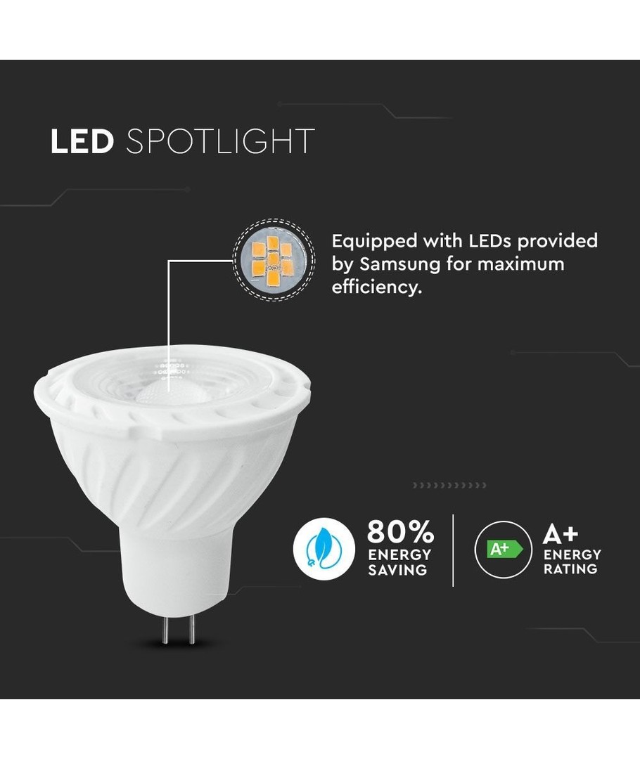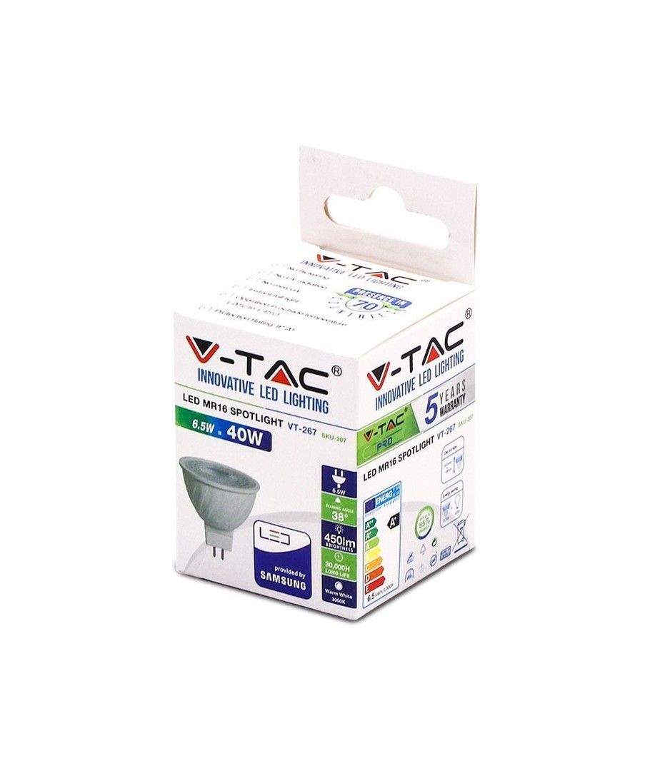 V-Tac 6,5W LED spotpære er en kompakt og energieffektiv LED spotpære, der har en lysstyrke på 450 lumens og et fokuseret lys på 38 grader.