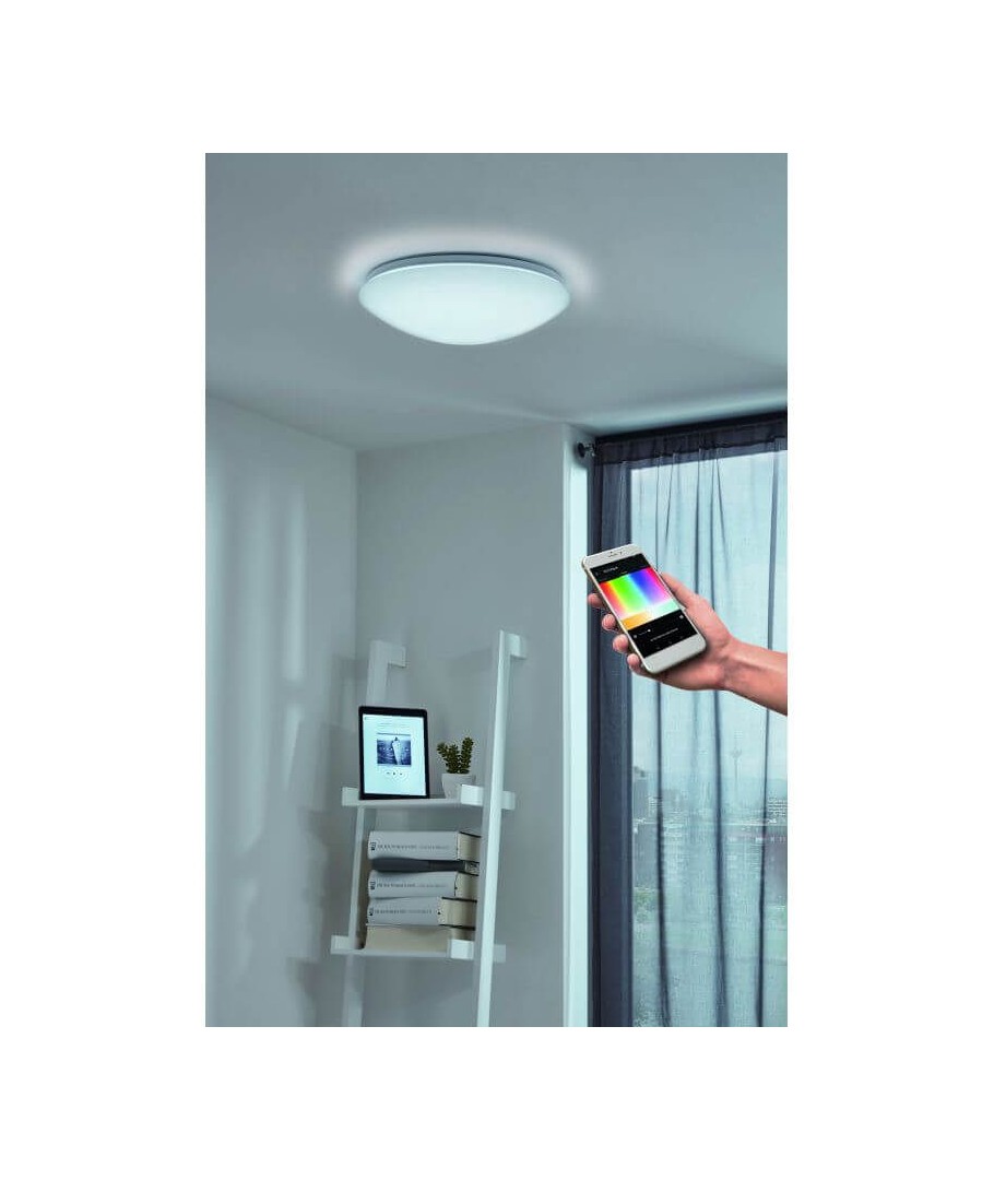 Indendørs plafond lampe som kan styres med fjernbetjening eller Awox App, og som kan monteres i både loftet og væggen.