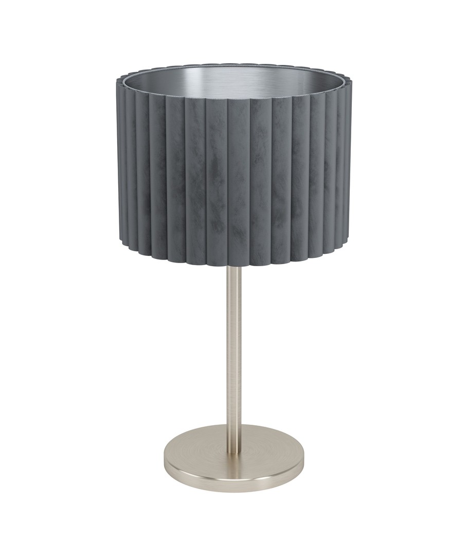 Fatningen er omgivet af en bred skærm af flot børstet stål, beklædt rustitk, gråt fløjl.