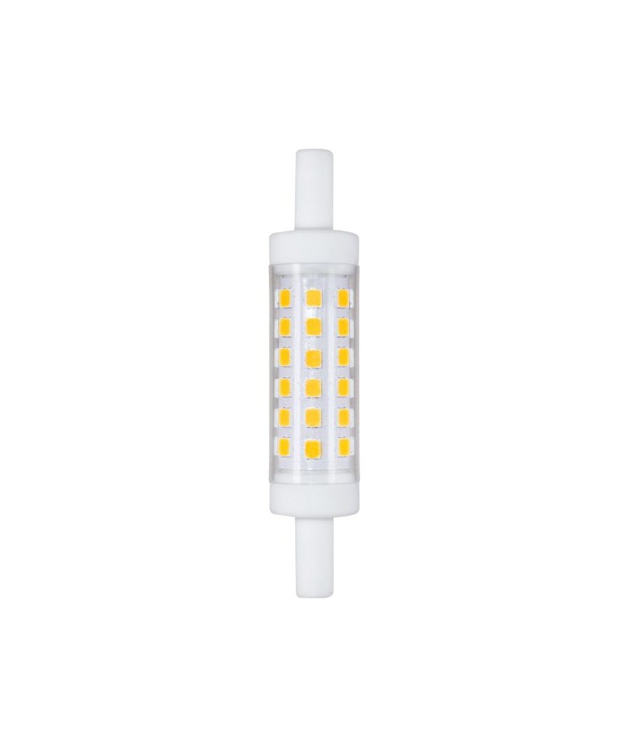 R7S 78mm / 5W LED pære kombinerer energieffektivitet med varm belysning i et klart glasdesign.