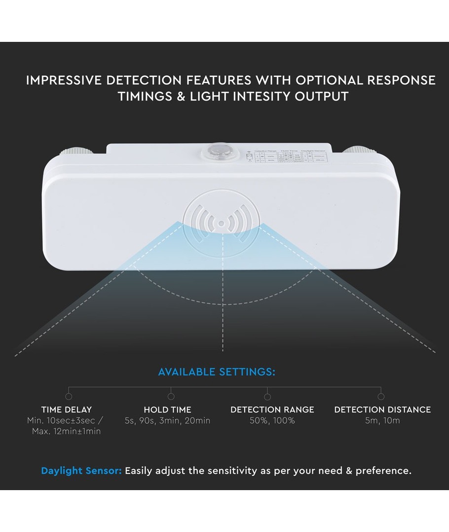 Den hvide mikrobølgesensor er en avanceret bevægelsessensor, der er designet til at levere pålidelig og effektiv lysstyring i både indendørs og udendørs områder.