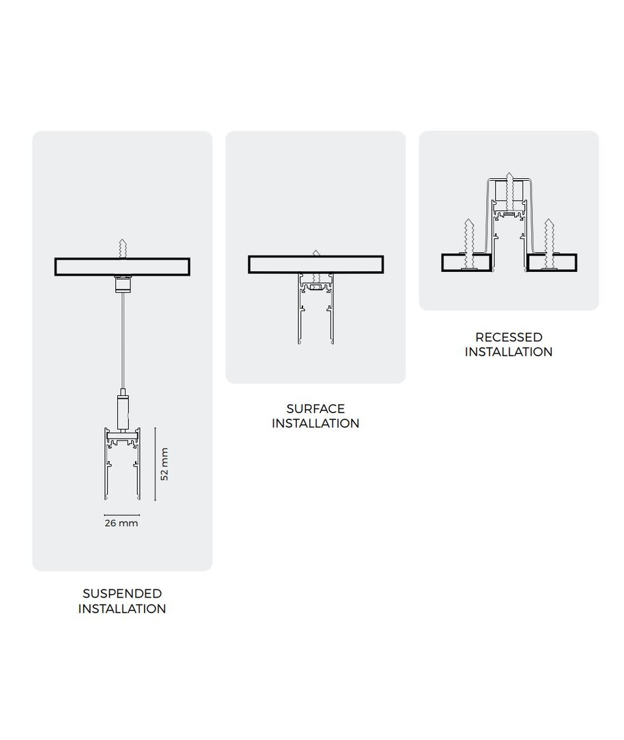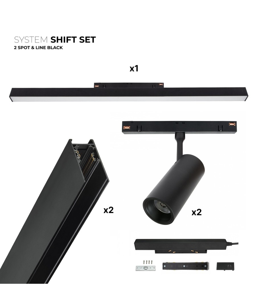 I dette SHIFT sæt får du 2x 1 meter skinne, 2 LED spots og en lysskinne, samt alt du skal bruge for at installere sættet.