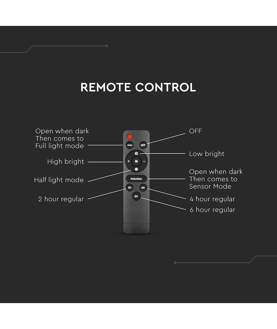 | Yderligere bemærkninger | Battery: LiFePO4 3.2V, 5000mAh Battery. Charging time: 4-6 Hours Sunlight Charging. Working time: 12(Min) - 15(Max) Hours. |