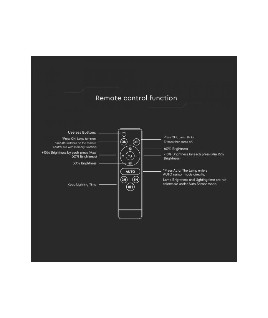 For yderligere bekvemmelighed leveres V-Tac 30W solcelle projektør med en fjernbetjening, så du kan styre lyset nemt og bekvemt fra afstand. Uanset hvor du er på din ejendom, kan du hurtigt tilpasse belysningen til dine behov.