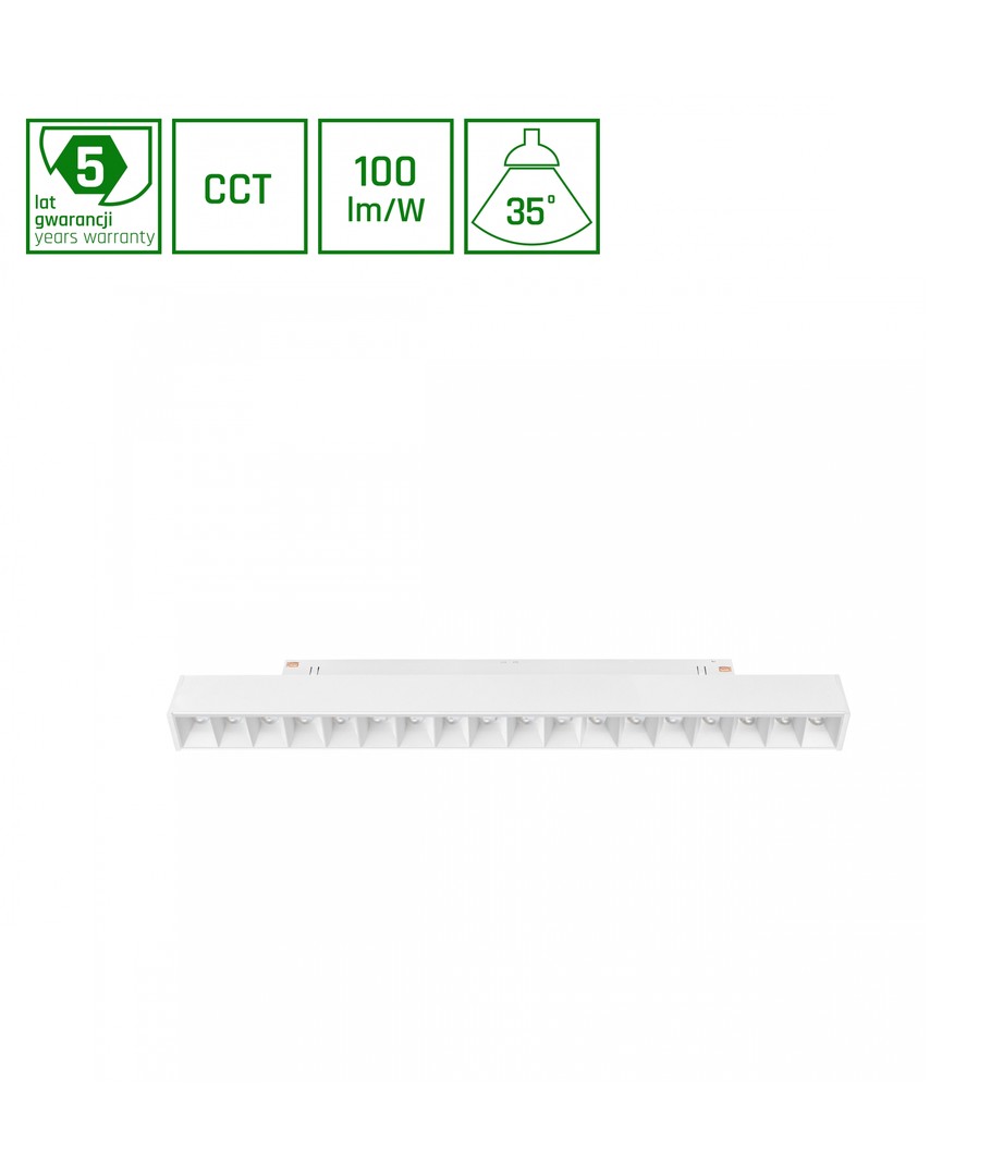 I en hvid finish og dimensioner på 330x23x42 mm, passer den diskret ind i ethvert rum og komplementerer moderne indretning. Med sit fokuserede lys på 35 grader tilbyder den en kontrolleret lysfordeling med en lysstyrke på 1000 lumens.