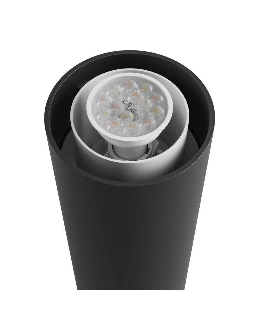 Med sin stilfulde sorte, runde form supplerer denne sokkellampe ethvert udendørs område. Designet gør den til en ideel løsning for dem, der søger både æstetisk appel og holdbar funktionalitet.