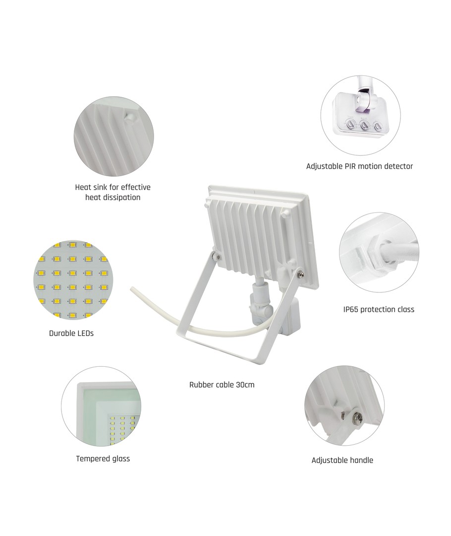 Integrationen af en sensor gør belysningen endnu mere praktisk og energieffektiv ved kun at aktivere lyset, når det er nødvendigt. Med Noctis Lux 3 LED projektørens elegante hvide finish og slanke design vil den stilfuldt komplementere enhver udendørs indretning. Sikringen af komplet belysning med bred dækning gør denne projektør til et must-have til dit udendørs rum.