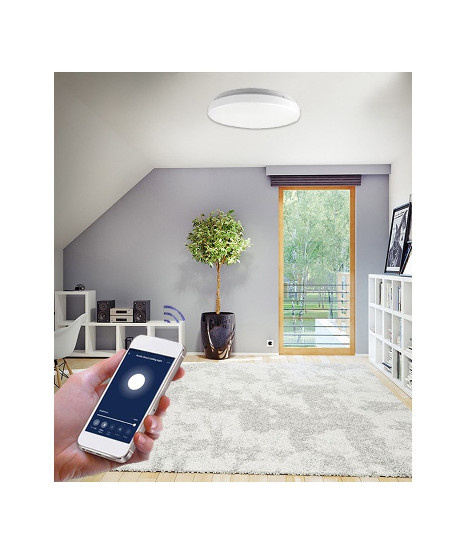 Loftslampen har indbygget wi-fi, der gør det muligt også at styre lampen fra din
