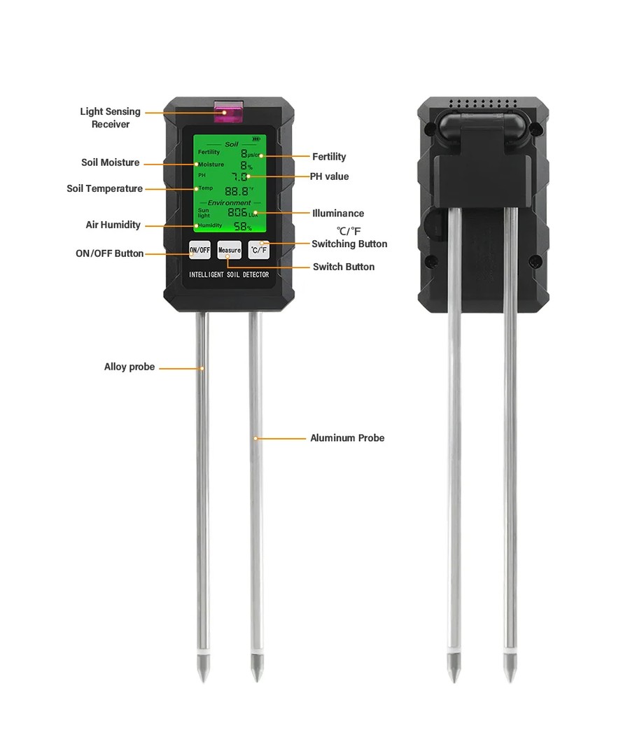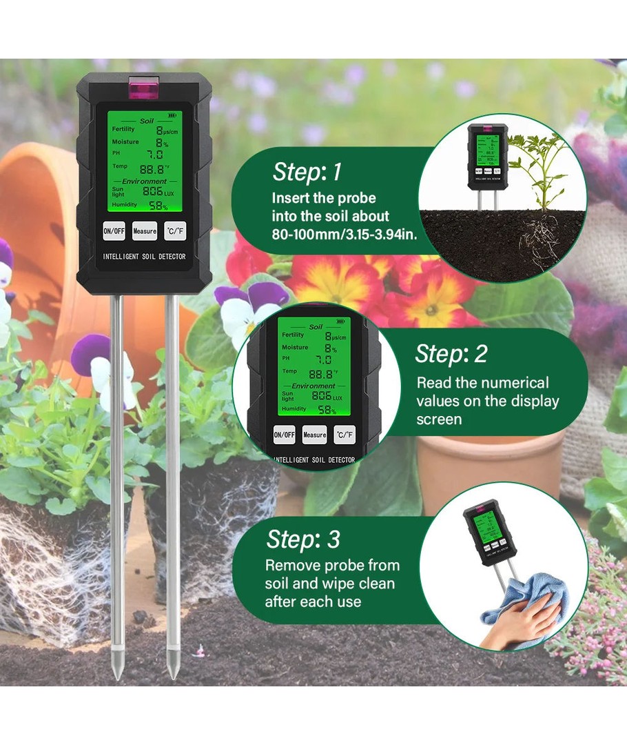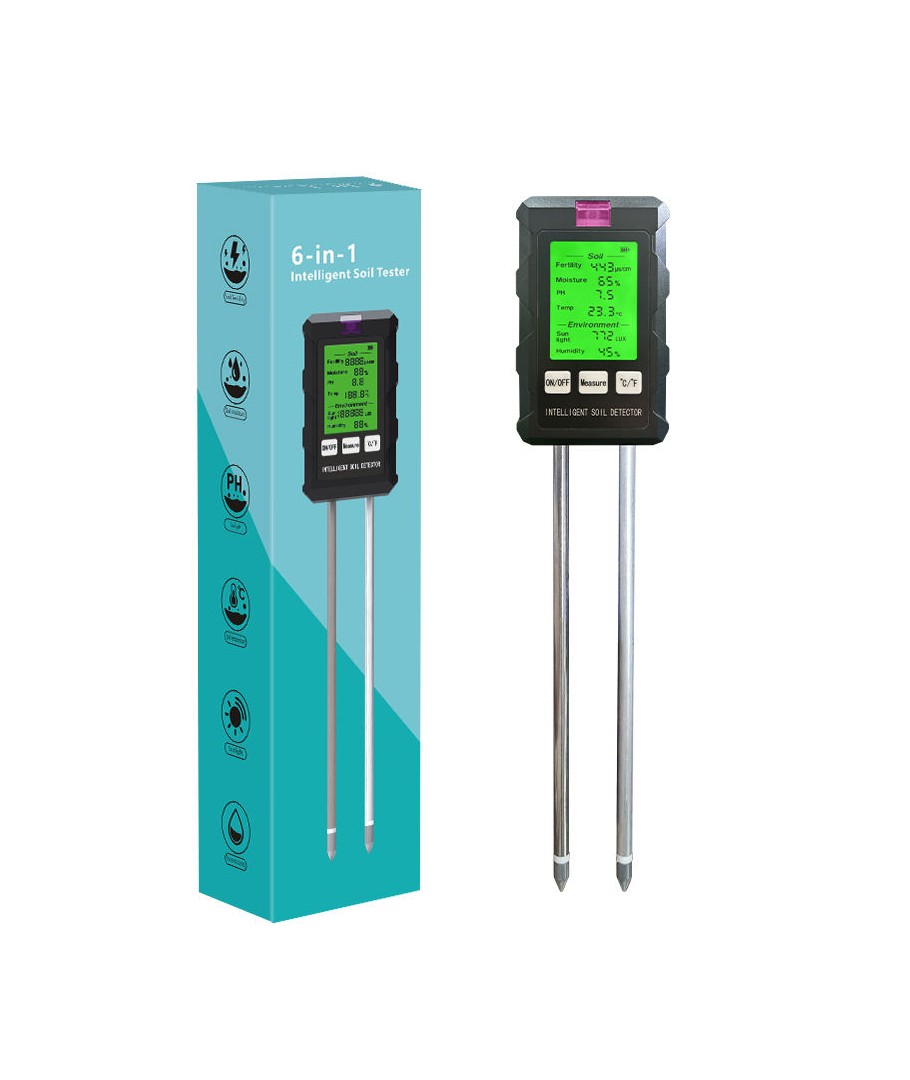 Oplev præcision og alsidighed med vores 6 i 1 måler, der forenkler plejen af dine planter ved at måle pH, fugt, temperatur, lysintensitet , næringsindholdet i jorden samt luftfugtighed i én kompakt enhed.