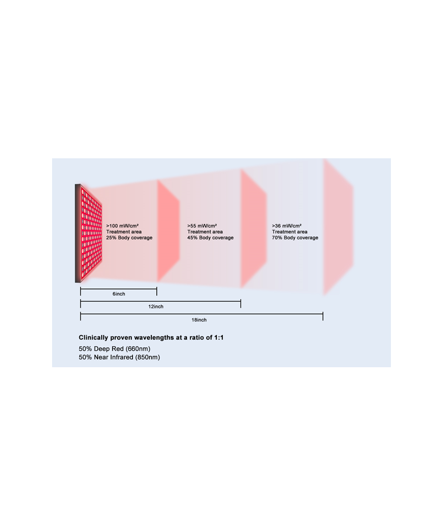 Dette skyldes, at intensiteten af lyset (irradiansen) spiller en kritisk rolle for, hvor dybt lysets energi trænger ind i kroppen. Det vil sige, at det ikke er tilstrækkeligt blot at forlænge eksponeringstiden foran et lyspanel med lavere styrke. Dybden af lysets penetration i kroppen øges ikke med længere tid, men afhænger udelukkende af lysstyrken.