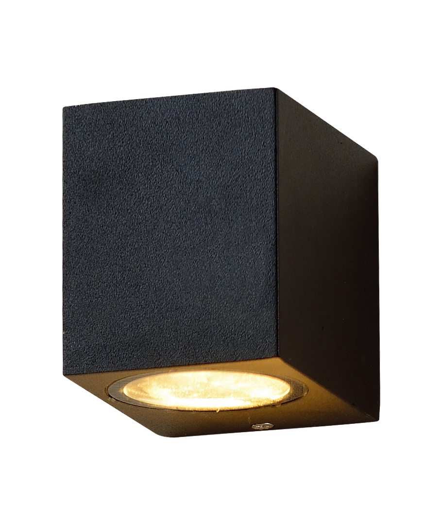 Moderne, kompakt og prisvenlig væglampe til montering udendørs på vægge under udhæng og andre steder, hvor der ikke løber vand ned af muren og om bag lampen.