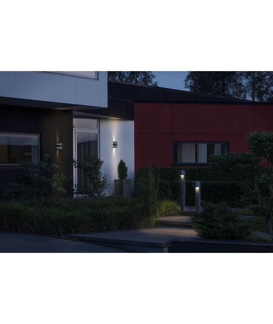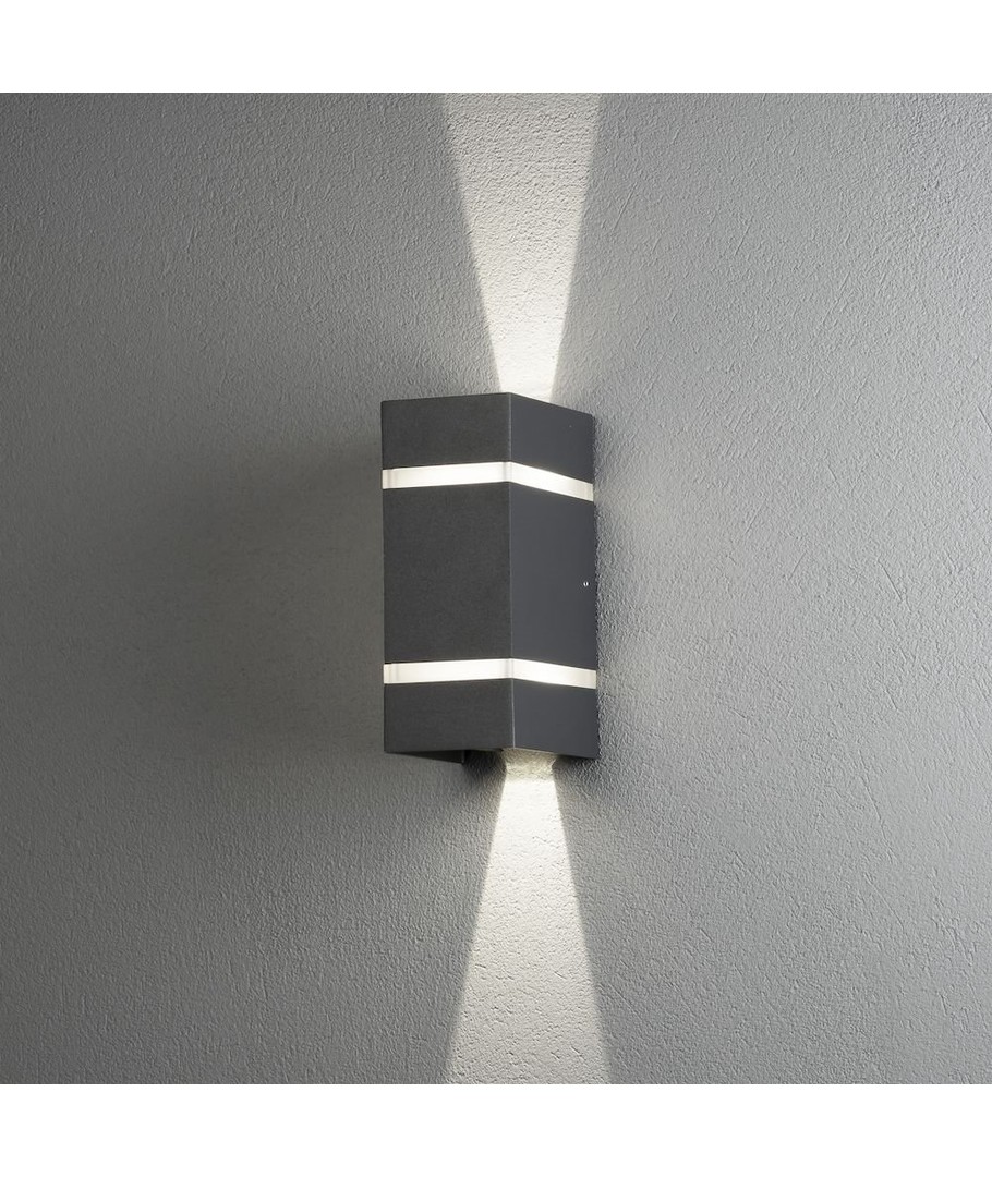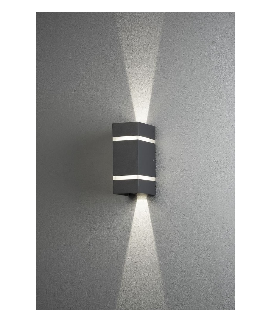 Cremona LED væglampe er en enkel og stilren udendørs lampe fra svenske Konstsmide. Lampen har to lyskilder, der lyser op og ned, lysets spredning kan justeres, så du får lige præcis den belysning, du måtte ønske.