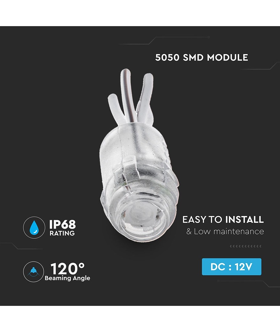 Med sin IP68-klassificering er modulerne fuldstændig vandtætte og kan endda fungere under vand i op til 1 meters dybde. Dette gør dem velegnede til applikationer som fontænebelysning, swimmingpools eller andre våde miljøer, hvor pålidelig, vandtæt belysning er et must.