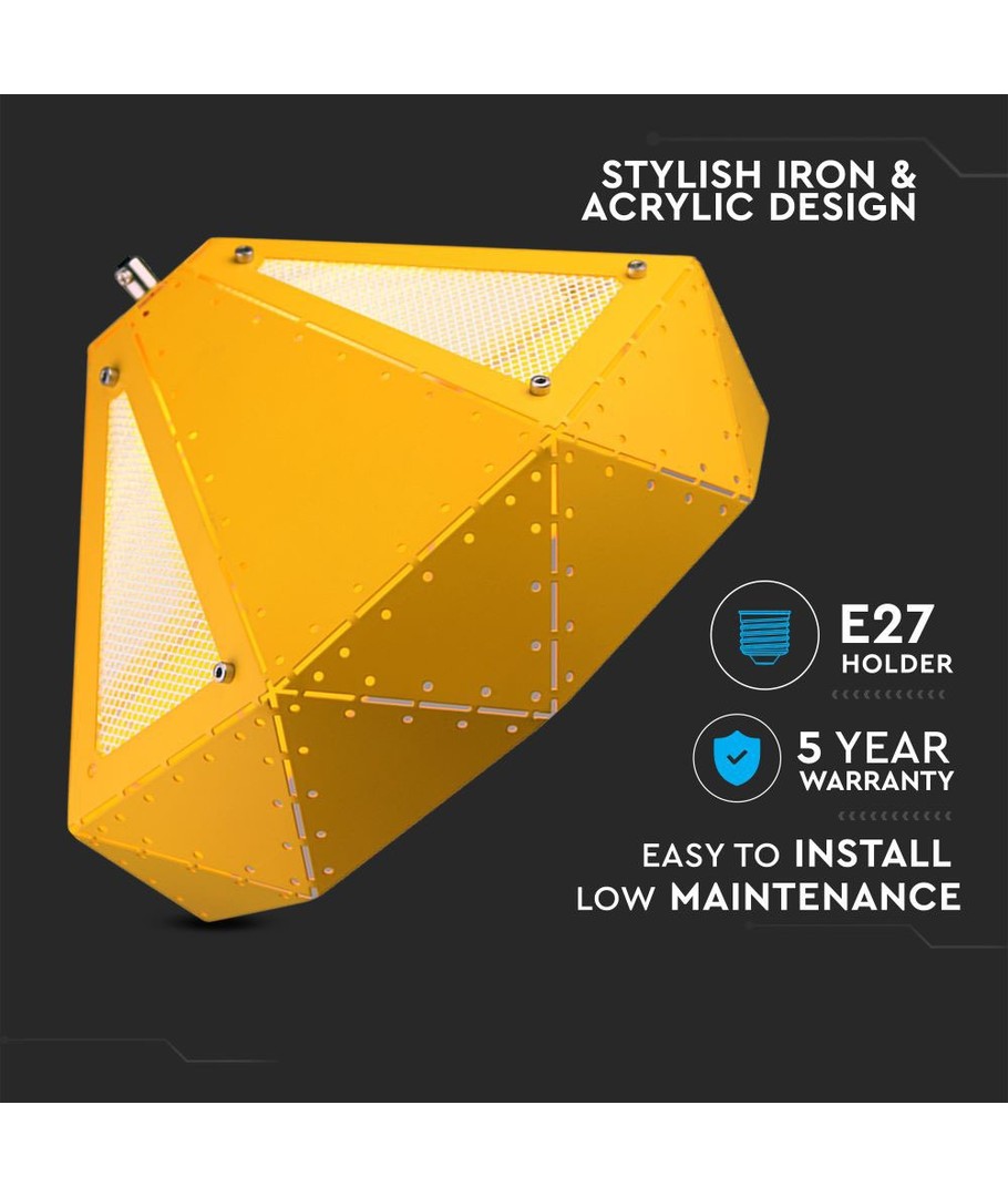 Den iøjnefaldende gule nuance af lampeskærmen tilføjer en livlig og frisk tonalitet, der komplimenterer moderne indretningstendenser. Denne lampe bruger en E27 fatning, hvilket gør det nemt at finde kompatible pærer, som passer til dine belysningsbehov.