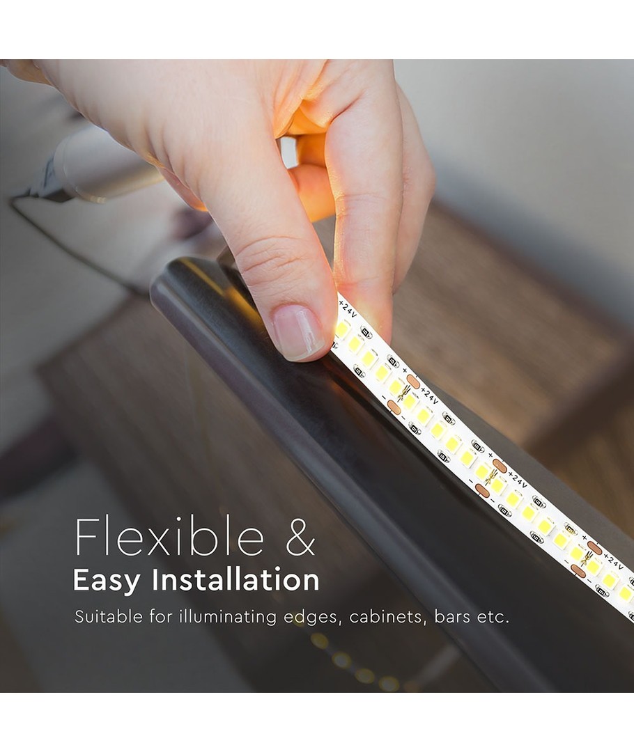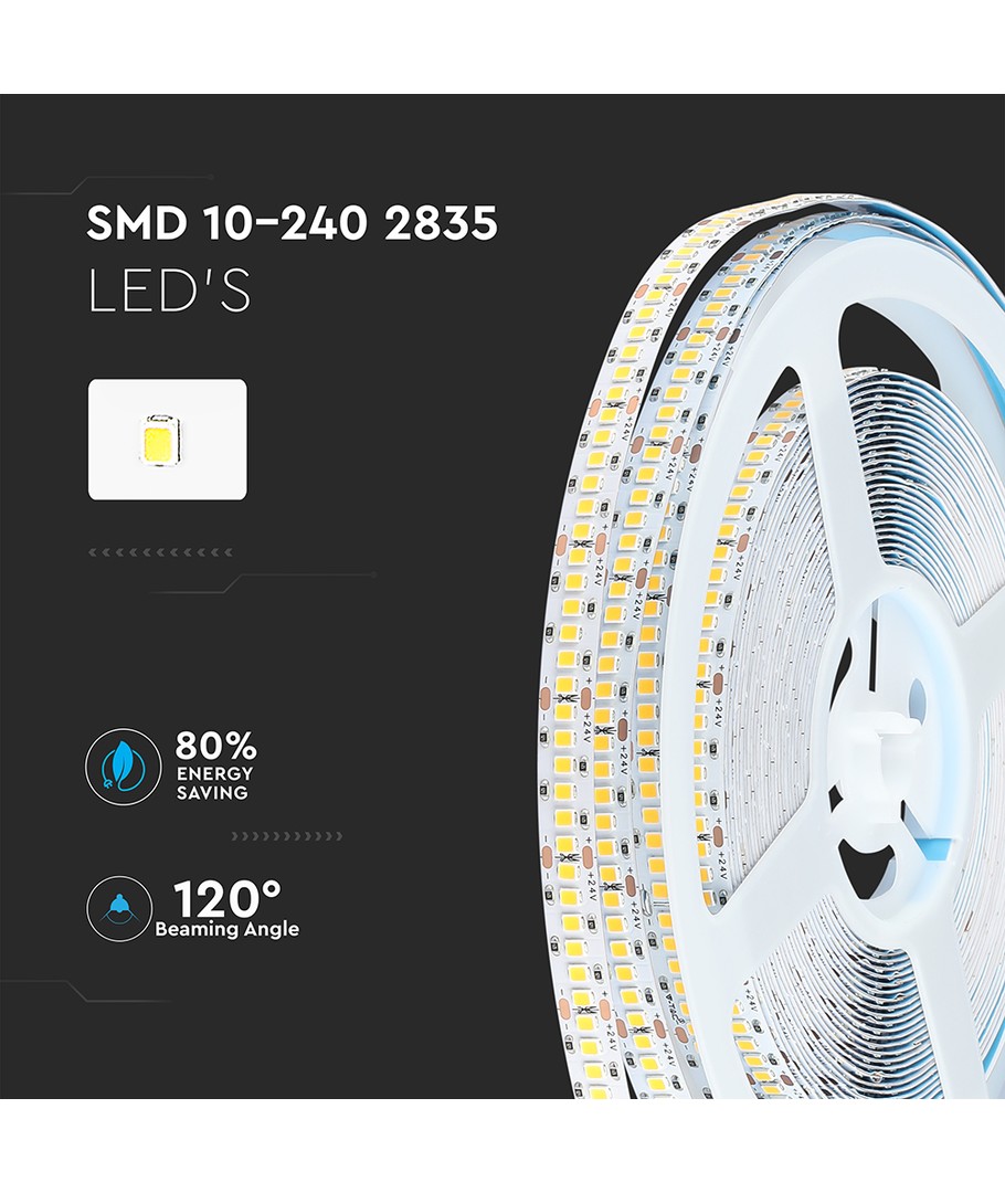Med en høj spredning på 120 grader sikrer denne LED strip en jævn og effektiv fordeling af lyset, hvilket skaber den perfekte atmosfære i ethvert rum. Produktet er designet til at levere en høj lyskvalitet med en RA værdi på 80-85, der garanterer et naturligt og ægte lys, som flot gengiver alle farver.