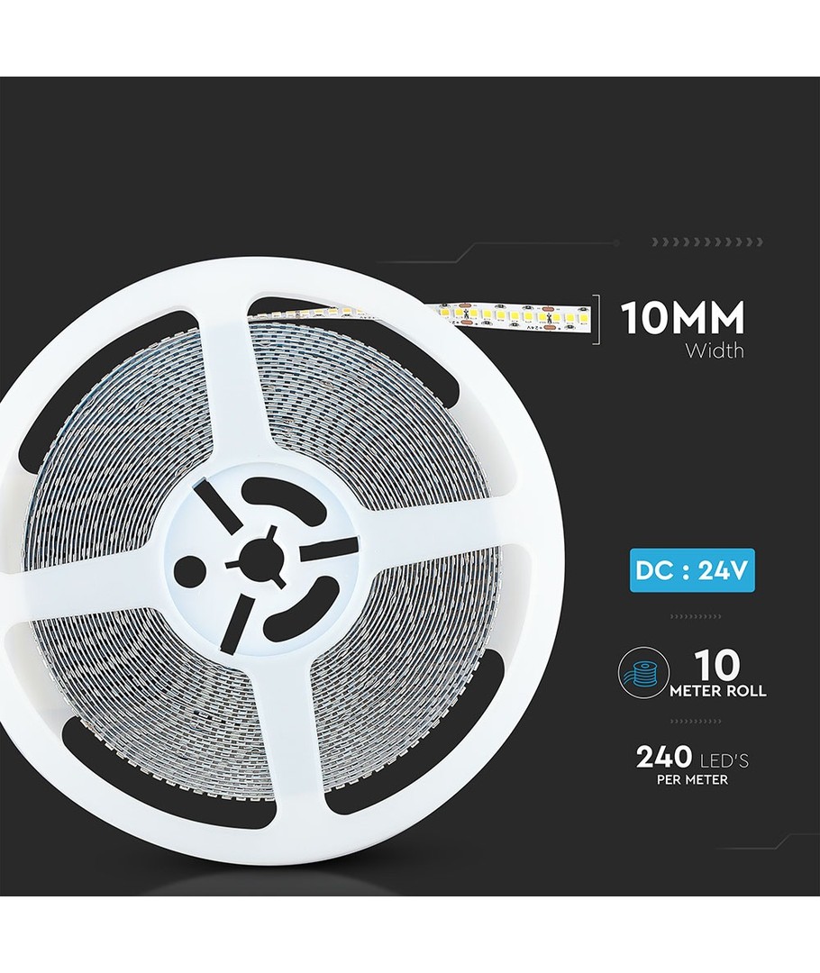 Produktet er designet med IP20 klassificering, hvilket betyder, at det ikke er modstandsdygtigt over for vand, og derfor bør det anvendes i tørre indendørs miljøer. Med dimensioner på kun 10 mm er LED strippen både kompakt og fleksibel, hvilket gør den nem at installere i forskellige opsætninger.