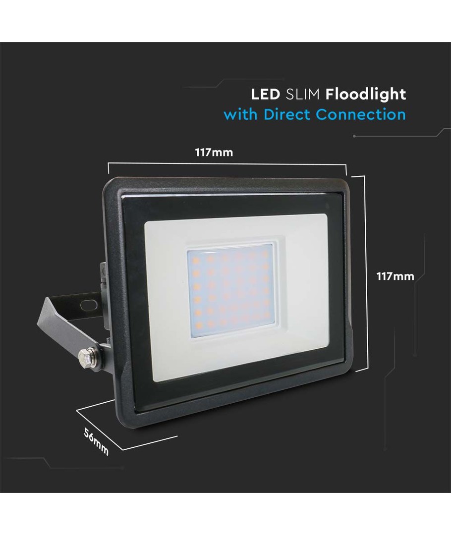 Med en solid konstruktion i sort hus og dimensioner på 177 x 56 x 117 mm, er denne LED projektør ikke kun robust, men også stilfuld. Designet til direkte tilslutning og med en IP65 klassificering, sikrer den problemfri brug udendørs, da den tåler vandstænk og regn.