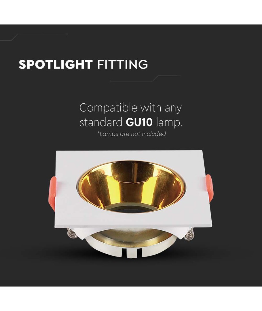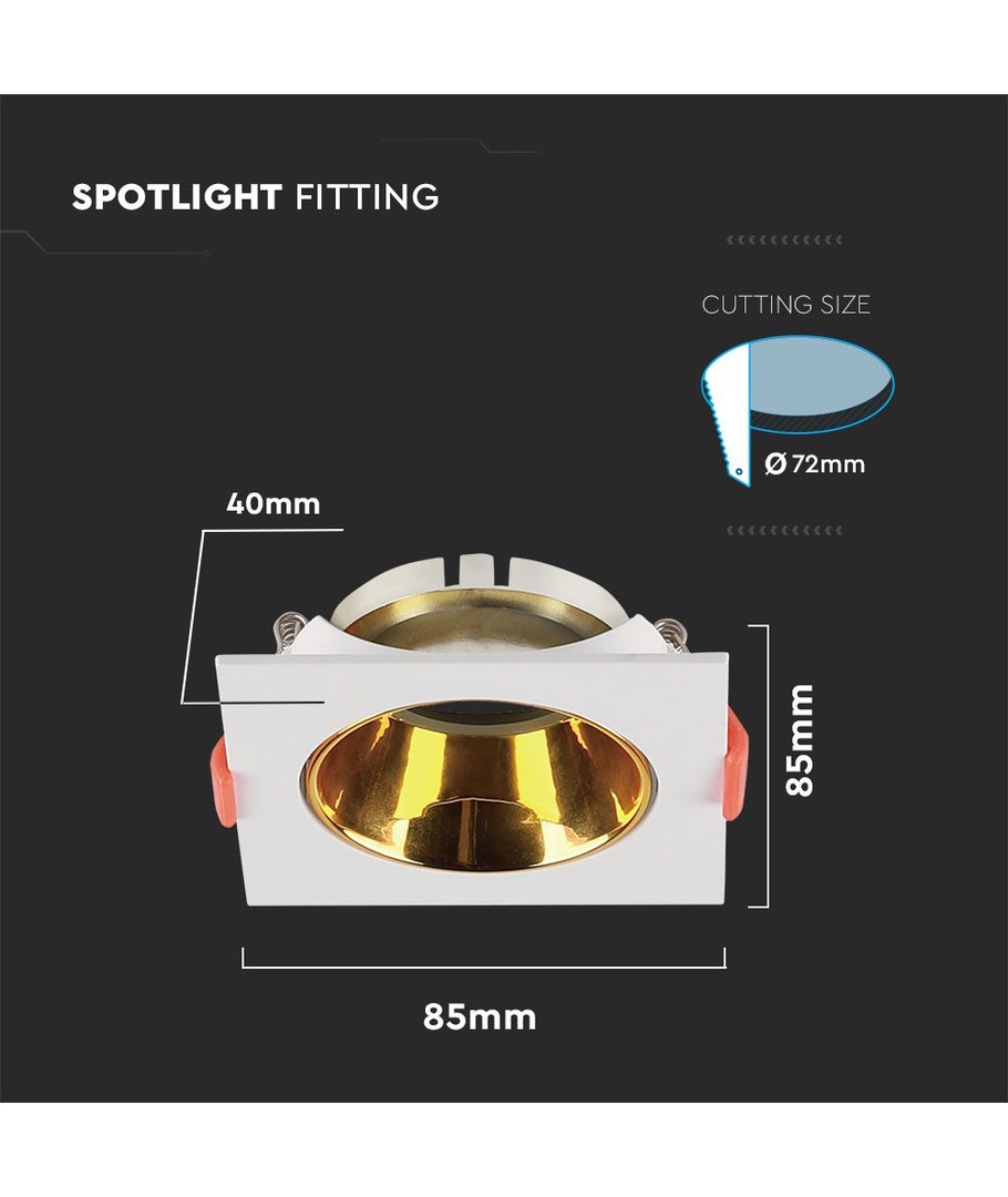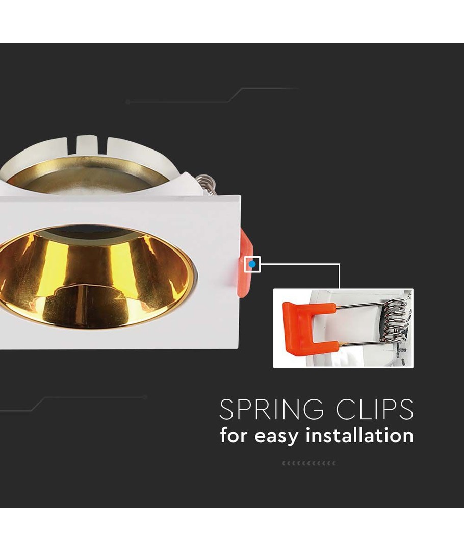 Forvandl dine rum med denne stilfulde og effektive belysningsløsning. Kombinationen af den tidløse hvide ramme og den luksuriøse guld reflektor vil helt sikkert imponere og give en varm, indbydende glød.