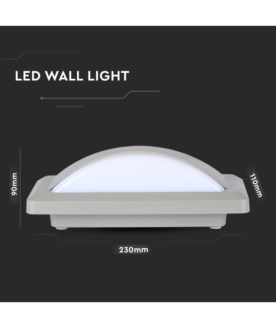 Lampehuset er i en elegant grå farve, dimensioneret til 230 x 76 x 110 mm, hvilket gør den perfekt til en bred vifte af indretningsstile. Den kan installeres på både indvendige og udvendige vægge, hvilket gør den velegnet til både bolig- og arbejdspladsbelysning.