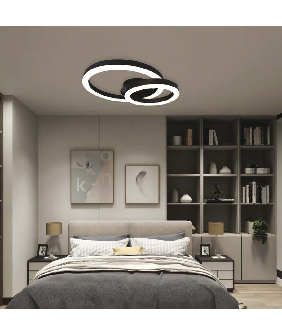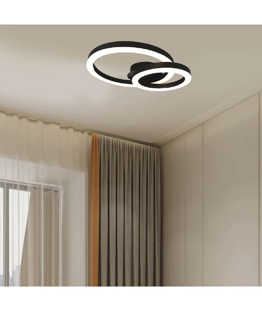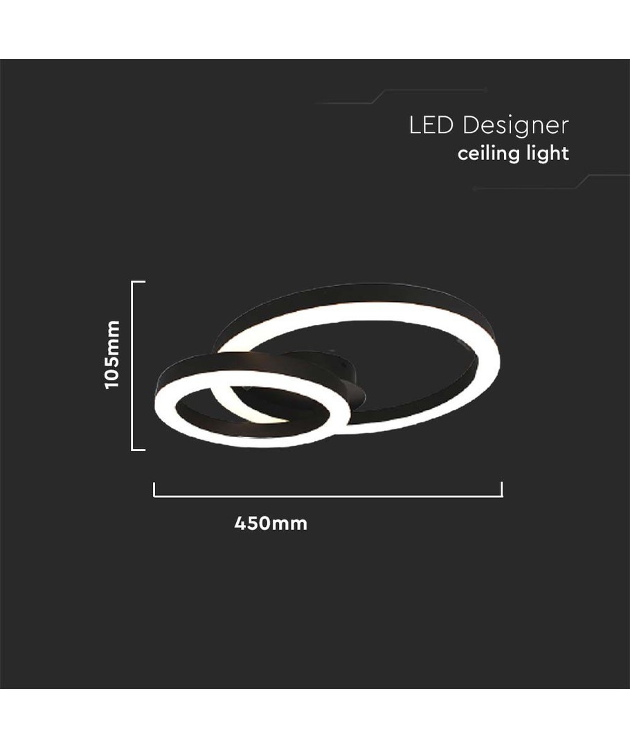 Lampen er designet med et moderne og stilrent udseende. Den to-rings form giver ikke kun et æstetisk udtryk, men sikrer også en jævn fordeling af lyset. Med sine dimensioner på 450 x 105 x 300 mm passer den perfekt i både store og små rum.