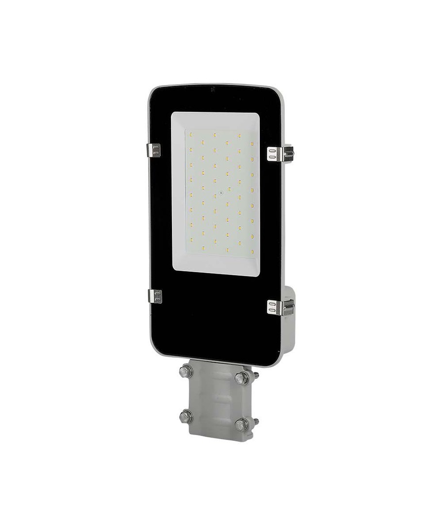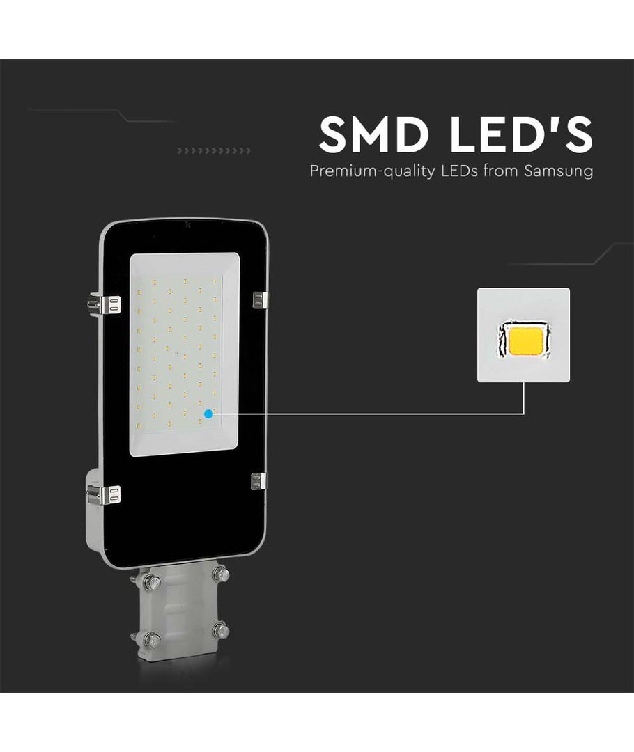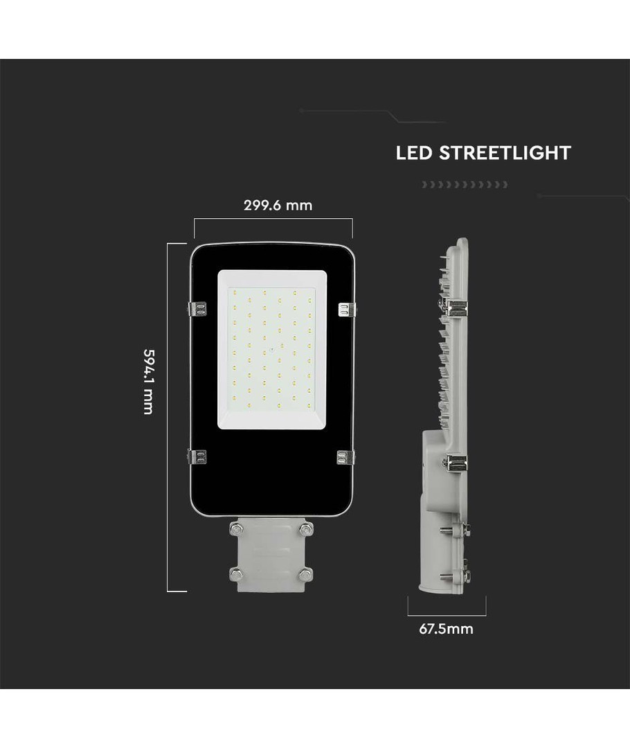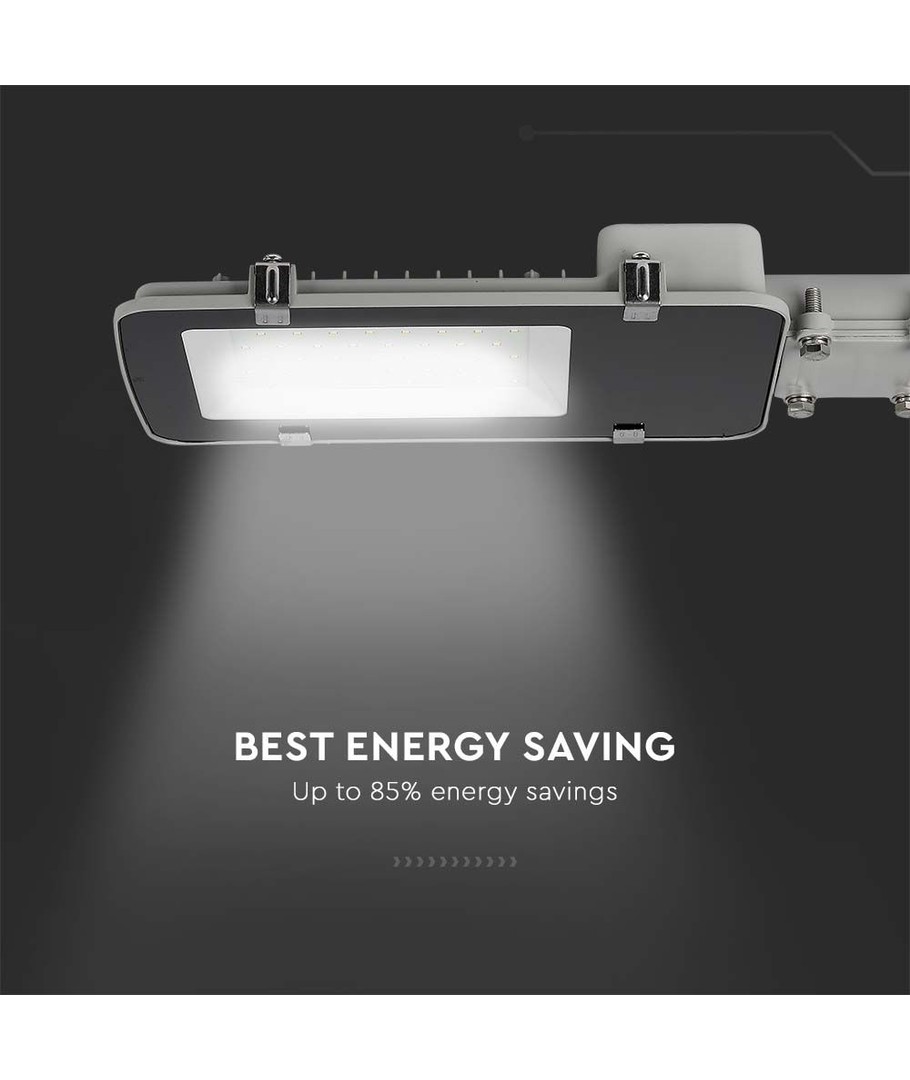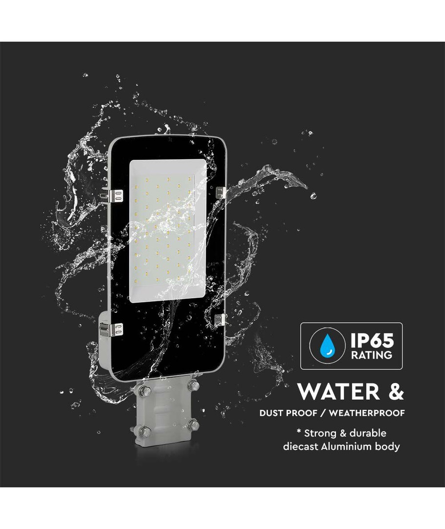 Med sit grå hus og en IP65-klassificering er denne LED vejlygte designet til at modstå de hårdeste vejrforhold, hvilket gør den perfekt til udendørs brug under regn og vandstænk.